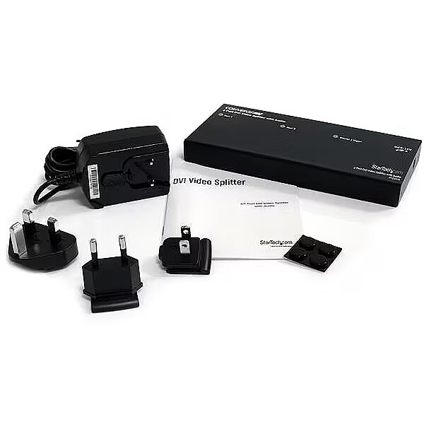 LongSummaryDescription - StarTech.com 2 Port DVI Video Splitter with Audio. Video port type: DVI, Video out: 2x DVI. Maximum resolution: 1920 x 1200 pixels, Product colour: Black, Housing material: Aluminium. Output voltage: 9 V, Output current: 0.6 A, Power consumption (typical): 5.4 W. Width: 85.2 mm, Depth: 181 mm, Height: 20 mm. Package width: 102 mm, Package depth: 221 mm, Package height: 98 mm