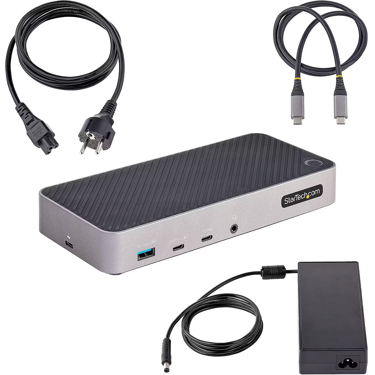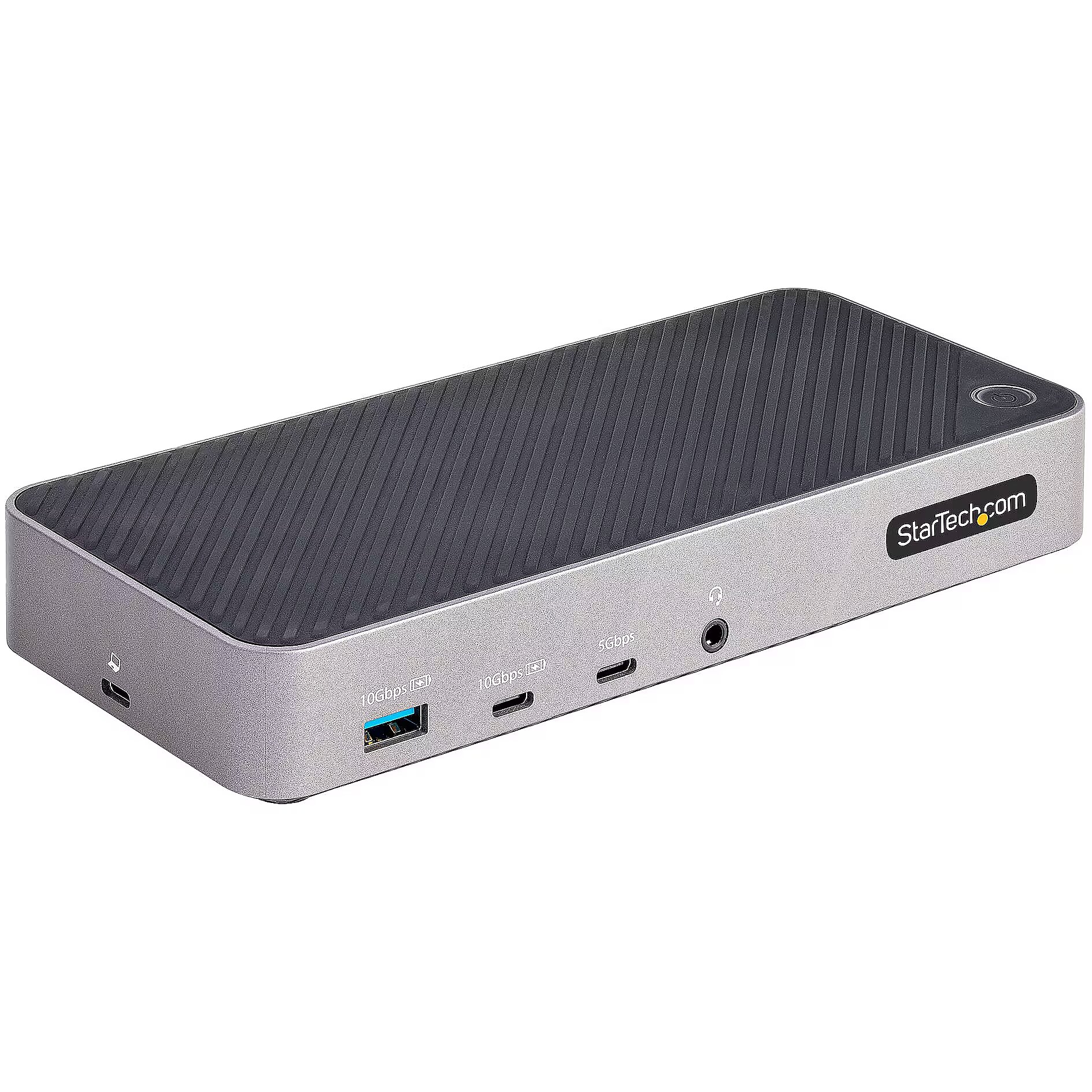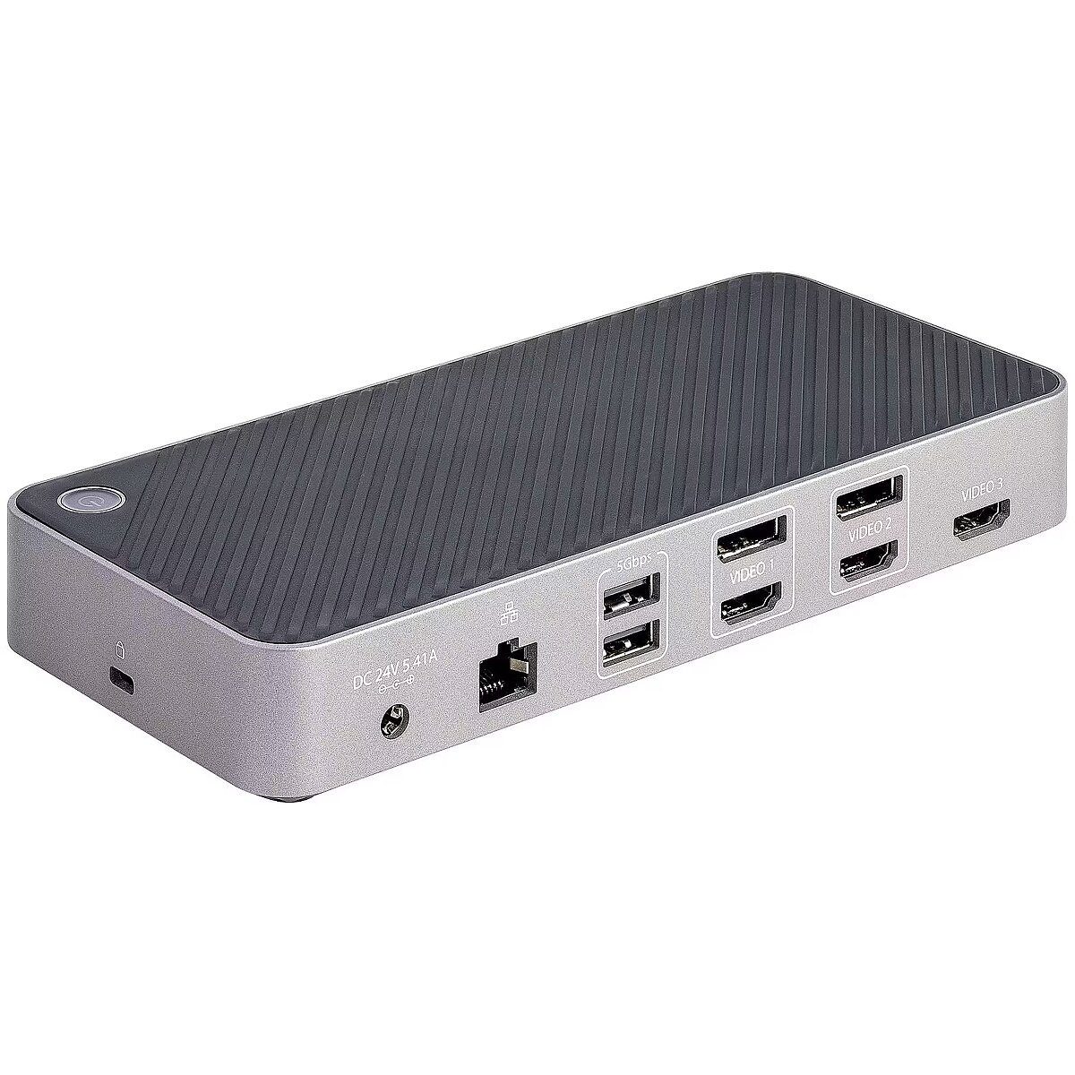 LongDesc - Seamlessly standardize across platforms with triple 4K display supportThis USB-C Triple 4K Monitor Docking Station enables wide workstation flexibility, featuring compatibility with USB-C, or Thunderbolt 3/Thunderbolt 4 laptops, and supporting multiple combinations of Ultra HD 4K DisplayPort and HDMI monitors.Enhance Productivity with Triple-4K VideoThis triple-4K docking station uses a combination of its integrated DisplayLink® graphics controller and your computer's DP Alt Mode enabled USB-C port to provide three independent 4K displays.Connect any combination of HDMI and/or DisplayPort monitors to Video Ports 1 and 2 (DisplayLink®); at resolutions up to 4K at 60Hz. Connect an HDMI monitor to Video Port 3 (DP Alt-Mode), at resolutions up to 4K at 30Hz. This high-resolution video performance is ideal for detailed graphics applications, enhancing your productivity by expanding the display capabilities of your laptop.Full-Featured Docking StationConnect the docking station to your computer's USB 3.2 Gen 2 (10Gbps) Type-C port to provide a wide range of port connectivity, options and features. The docking station features:• 2x USB-A and 1x USB-C (USB 3.2 Gen 1 5Gbps) ports for USB peripheral devices.• 1x USB-A and 1x USB-C (USB 3.2 Gen 2 10Gbps) port that supports BC 1.2 with 7.5W (1.5A) for charging tablets and smartphones.• 1x Gigabit Ethernet port with WoL (Wake-on-LAN) for a wired Local Area Network (LAN) connection.• 1x 3.5mm 4-position TRRS Audio Jack for a 3.5mm headset.100W USB Power DeliveryThe USB-C docking station supports 100W USB Power Delivery with the included power adapter. This allows you to charge the connected host device, as well as the devices connected to the BC 1.2 USB charging ports.For added protection to connected USB devices, the BC 1.2 enabled USB charging ports feature Overcurrent Protection (OCP). OCP prevents USB peripherals from drawing more power than is safely allocated for the port.Easy DeploymentConnect the dock to your host computer, using the included 3.3ft (1m) USB-C cable. The docking station supports all major operating systems, including Windows, macOS, ChromeOS, and Ubuntu. This dock was designed for seamless integration with any compatible USB-C equipped device within your organization, including Lenovo X1/Thinkpad P Series, Dell Latitudes/Precision/XPS 15, HP Envy, Surface Laptop 3, and M1 Pro/Max/M2 MacBooks. The dock features a side-facing K-Slot for added security in shared workspaces (e.g., BYOD hoteling/hot-desking).Enhance Productivity and Device Management with the StarTech.com Connectivity Tools ApplicationDeveloped to improve performance and security, StarTech.com Connectivity Tools is the only software suite on the market that works with a wide range of IT connectivity accessories. The software suite includes:•Advanced Windows Layout Utility : Setup and save custom windows layouts.•Mac Address Pass-Through Utility : Improve network security.•USB Event Monitoring Utility : Track and log connected USB devices.•Wi-Fi Auto Switch Utility : Enable users to quickly access faster network speeds via wired LAN.For more information and to download the StarTech.com Connectivity Tools application, please visit: www.StarTech.com/Connectivity-ToolsThis product is backed for 3-years by StarTech.com, including free lifetime 24/5 multi-lingual technical assistance.