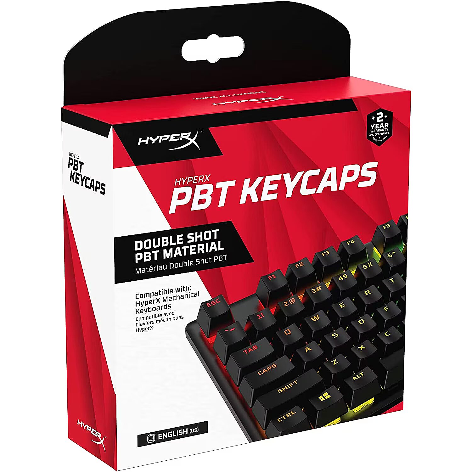 LongDesc - Durable Keycaps with Shine-Through FontHyperX PBT Keycaps are durable and feature our signature HyperX font, which is designed to let keyboard lighting shine brilliantly. These double shot PBT keycaps are thicker, more durable, and more resistant to solvents. The full key set is compatible with most HyperX mechanical keyboards and most other mechanical gaming keyboards and a stylish HyperX keycap removal tool is included for easy installation.Durable in Different StylesHyperX PBT keycaps are made with thick walls and are resistant to wear, friction, and solvents. They’re available in different color options to mix and match with various keyboard styles.Signature HyperX shine-through fontThese PBT keycaps are made with thick walls and are resistant to wear, friction, and solvents.Stylish keycap removal tool includedOur keycap removal tool is specially-designed to precisely fit HyperX keycaps.Compatible with most HyperX mechanical gaming keyboardsThe full key set is compatible with most HyperX mechanical keyboards and mechanical gaming keyboards with a standard bottom row. They complement the exposed LED design of HyperX mechanical key switches.