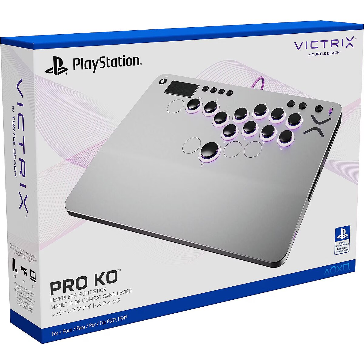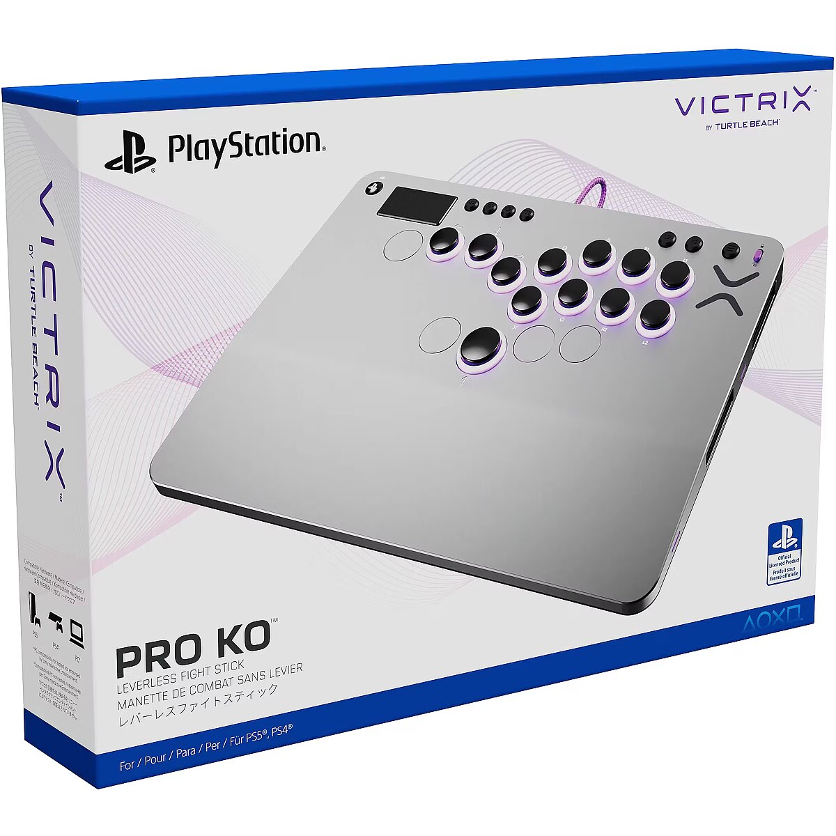 LongDesc - Knock out the competition with the fully customizable PlayStation officially licensed Victrix™ Pro KO™ Leverless Fight Stick. Ensure precise hits with reliable and hot swappable Cherry MX Speed Silver RGB switches, ideal for clutch moments. Designed to fit your play style, the Pro KO™ includes customizable lighting, 16 moveable and mappable buttons, cable and button organizers for easy transportation, plus a control bar for swift adjustments. For those who love to mod, you’ll appreciate the removable aluminum top plate allowing you to adjust button positions or change to your preferred switches. Elevate your gaming and compete at a professional level today. FULLY CUSTOMIZABLE TO FIT YOUR STYLEWith a removable aluminum faceplate, you can easily remap or move up to 16 buttons to build your own layout. The hot swappable Cherry MX Speed Silver RGB switches are also easy to replace to fit your gaming style.TOURNAMENT READYPacked with all features required by the Pros, including a Tournament Lock Switch to avoid DQs, a lock mechanism for your 3m braided USB-C cable, and an ergonomic 6.28° wrist slope for all-day comfort.BUILT WITH THE PROS FOR THE PROSThe patent-pending 16 mappable and moveable button layout for the Pro KO was optimized by legendary fighting game champion Momochi to provide the best gaming experience possible.MILLIONS OF COLOR COMBINATIONSBlow away the competition with a beautiful display of RGB light rings around the buttons. Customize directly on the Pro KO with millions of additional color combinations and lighting modes using the free Victrix Control Hub app.TRAVEL MADE EASYTravel with ease with the Pro KO’s premium slim design, fitting comfortably in your backpack or carried over your shoulder with a strap attached to the built-in strap bars.
