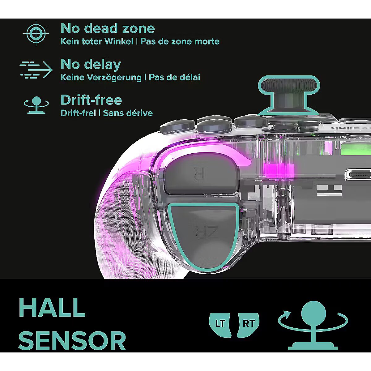 description_short_en - Wireless gamepad for Nintendo Switch/PC/PS3/Android Stylish transparent housing with RGB lighting Vibration effects to liven up the game Two connection methods: Bluetooth & 2.4 GHz Battery lasts up to 8 hours