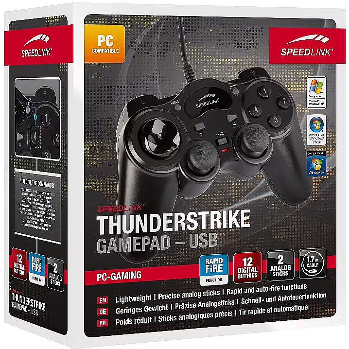 description_en - The Thunderstrike Gamepad makes gaming fun and easy on the PC thanks to its clear layout and driverless installation. It has eight digital buttons for action-packed games, plus it features four quick-access shoulder buttons and two analogue sticks for fast and precise commands. In addition, you can activate the rapid or auto-fire functions at the touch of a button – a really handy feature that gives you an in-game tactical advantage. PC gamepad with USB connector 8 front and 4 shoulder buttons 8-way D-pad 2 precise analogue sticks with button function Analogue and digital mode Switchable rapid and auto-fire functions Driverless installation DirectInput compatible Robust construction Lightweight 1.7m cable