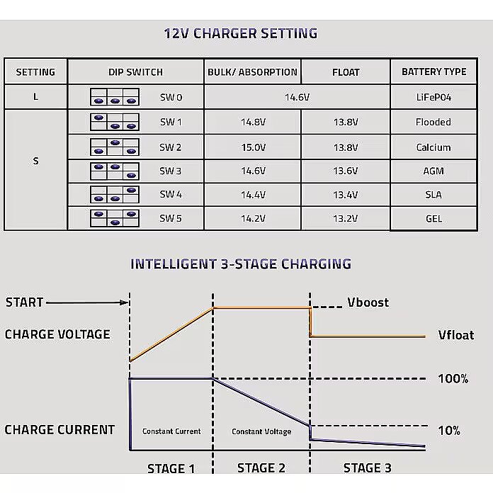 The BOOST stage is the so-called absorption charging, it keeps the charging voltage constant between 14.1VDC and 14.8VDC, reducing the charging current,