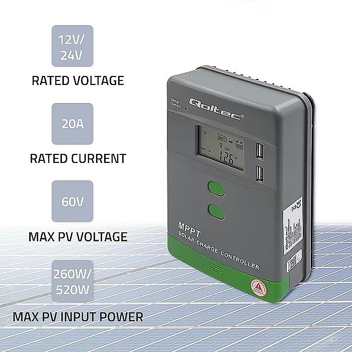 Qoltec Solar charge controller MPPT 20A,12V 24V,2xUSB