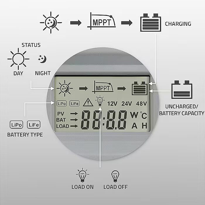 The controller uses MPPT technology, which maximizes energy efficiency by enabling optimal utilization of solar power. It continuously monitors and adjusts the voltage and current from the photovoltaic panels to ensure maximum power point tracking. This advanced energy management allows for the highest possible efficiency from solar panels, even under varying weather conditions such as partial shading or changes in sunlight intensity.