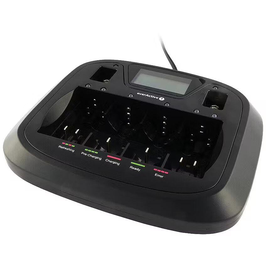 Description - Ładowarka akumulatorków Ni-MH uniwersalna everActive NC-900U Szybka, niezawodna, UNIWERSALNA, procesorowa ładowarka z LCD everActive NC-900U z gniazdem USB. Posiada 8 w pełni niezależnych, inteligentnych kanałów ładowania z funkcją odświeżania/rozładowania 6x R03 AAA, R6 AA wymienne z 4x C R14, D R20 + 2 kanały do ogniw 9V/6F22, ładuje bez trudu pojedyncze ogniwa i nieparzyste, nietypowe konfiguracje akumulatorów. Zapraszamy do zapoznania się z prezentacją ładowarki everActive NC-900U