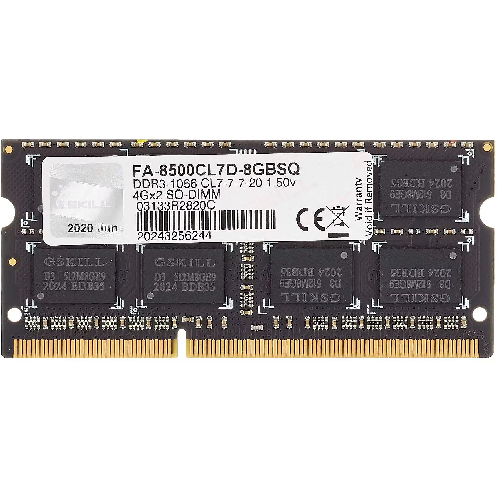 Technical_details - DDR3-1066 PC3 8500 8GB(4GB x 2) CL 7-7-7-20 1.5 Volts. Model name F3-8500CL7D-8GBSQ Capacity 8 GB (2 x 4096 MB) Module amount 2 pieces placement two-sided memory chips amount 32 (16per module) data density 2048 each memory chip organisation 256Mx8 Design SO-DIMM Type DDR3 Connection 204-Pin Voltage by 1.425 Voltage until 1.575 Voltage Standard DDR3-1066 (PC3-8500) Timings CAS latency (CL) 7 RAS-to-CAS delay (tRCD) 7 RAS-Precharge time (tRP) 7 Row-Active time (tRAS) 20