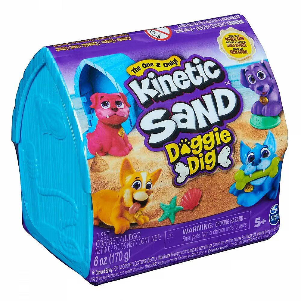 LongDesc - Dig for treasures with Kinetic Sand Doggie Dig! This Kinetic Sand kit includes 6oz of Beach Sand, 1 of 4 super cute dogs that double as a multipurpose tool and two treasures. Doggie Dig will spark imagination and excitement as kids use their beagle, pug, husky, or corgi’s paws to dig through the play sand, revealing their dog-themed hidden treasures! They may even find the golden treasure! With four dogs to collect (each sold separately), kids can play with hidden stamps, a knife, or a mold for endless ways to play. The reusable doghouse container folds up for convenient storage. The One and Only Kinetic Sand is made from natural sand that sticks to itself for easy cleanup! Create again and again and let it flow through your hands – it’s so satisfying, you won’t be able to put it down! Kinetic Sand is an exciting alternative to arts and crafts modeling clay and is a welcome addition to the craft table, sensory bin, kids activities time and Montessori toys. Kinetic Sand promotes fine motor skills and creativity in kids aged 5 and up through independent tactile play. What dog-themed world will your child create with Kinetic Sand Doggie Dig?Includes: 6oz Kinetic Sand Beach Sand, 2 Accessories, 1 Dog Character, 1 Doghouse Container with Dog Bed (Inside), 1 Collector Sheet