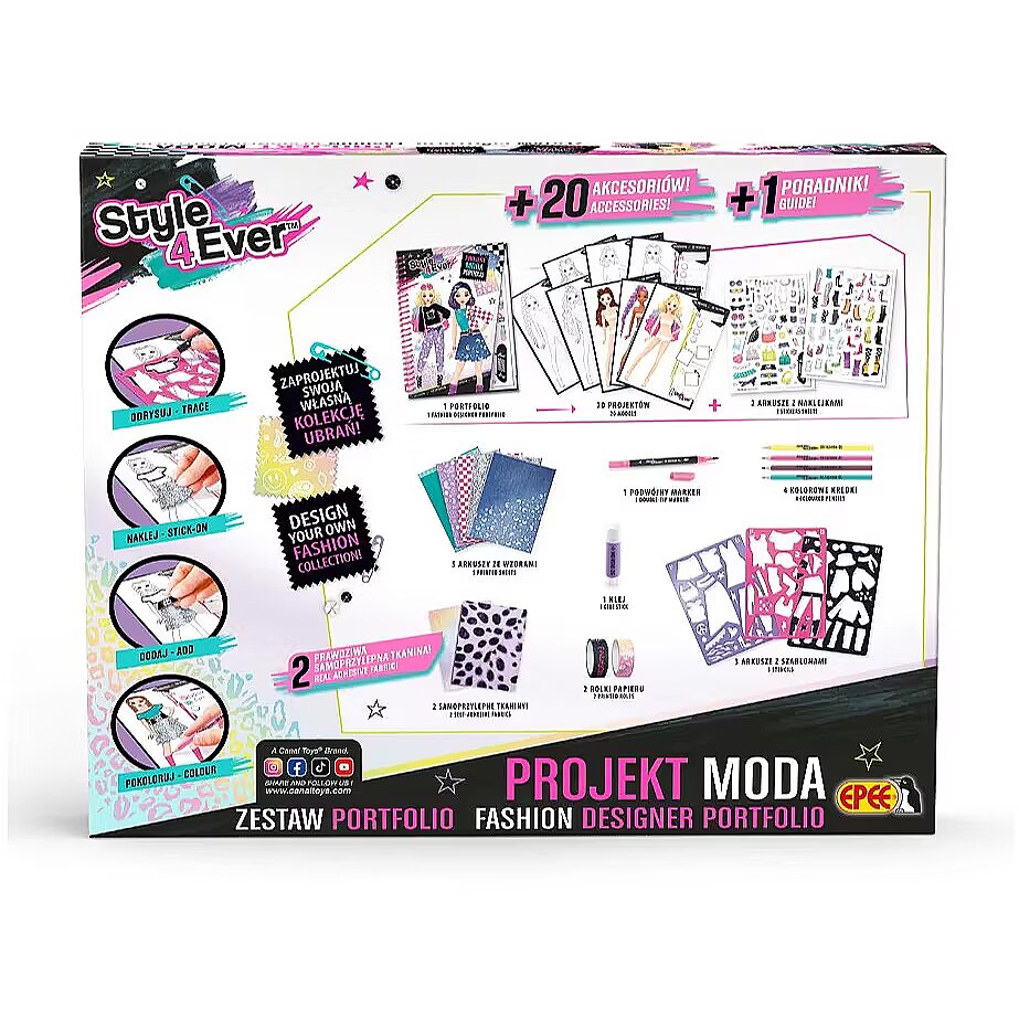 Dane techniczne: Załączone wyposażenie - 1 spiralny zeszyt z 20 szablonami, 3 szablony, 4 kredki ołówkowe, 2 arkusze tkaniny samoprzylepnej, 5 arkuszy papieru drukowanego, 2 rolki papieru drukowanego, 1 marker z podwójną końcówką, 1 klej, 1 poradnik projektanta