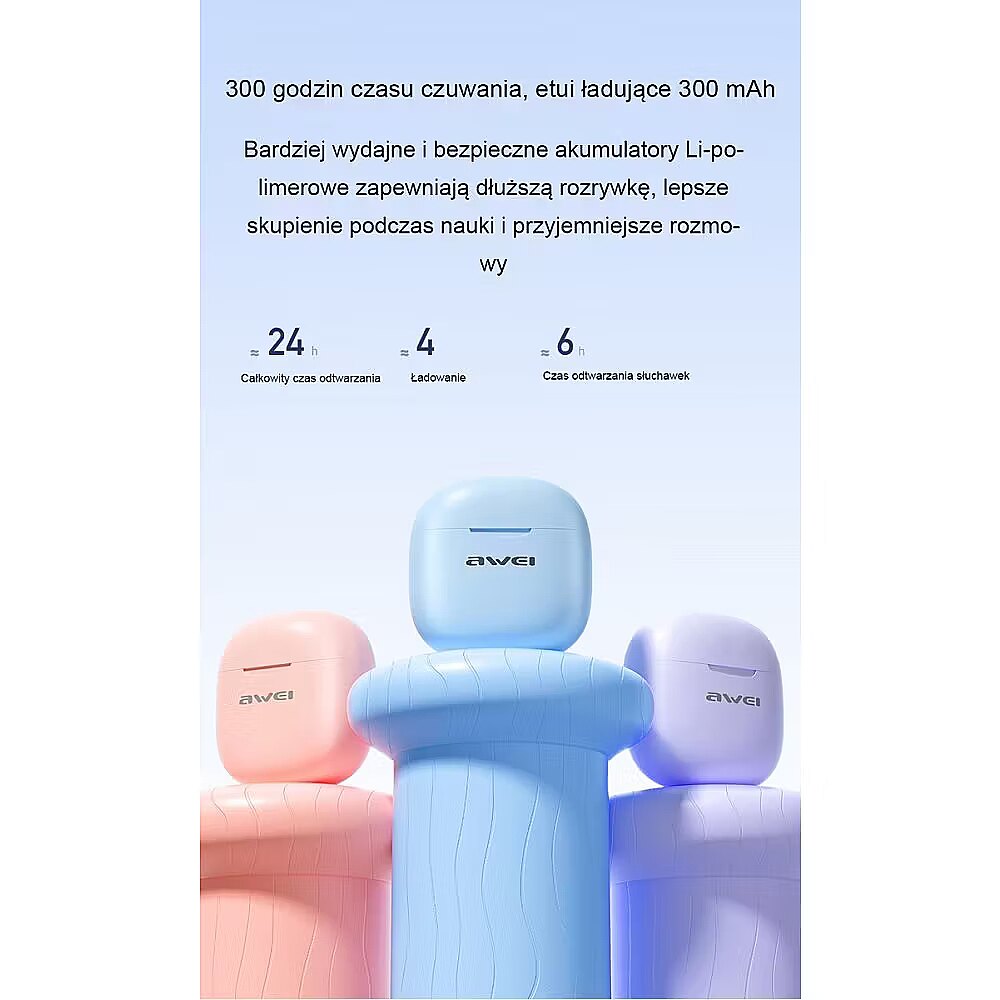 Description - AWEI TWS Charging Base Headset with ENC and Bluetooth 5.3 Supports professional tuning and highly elastic composite diaphragms to create a natural stereo field, enhance the stability of sound quality, and reduce acoustic resonance and THD (total harmonic distortion) to improve sound clarity. It has Bluetooth 5.3, which enhances resistance to electromagnetic interference, no jams or disconnections, fast transmission and low power consumption for audio playback.