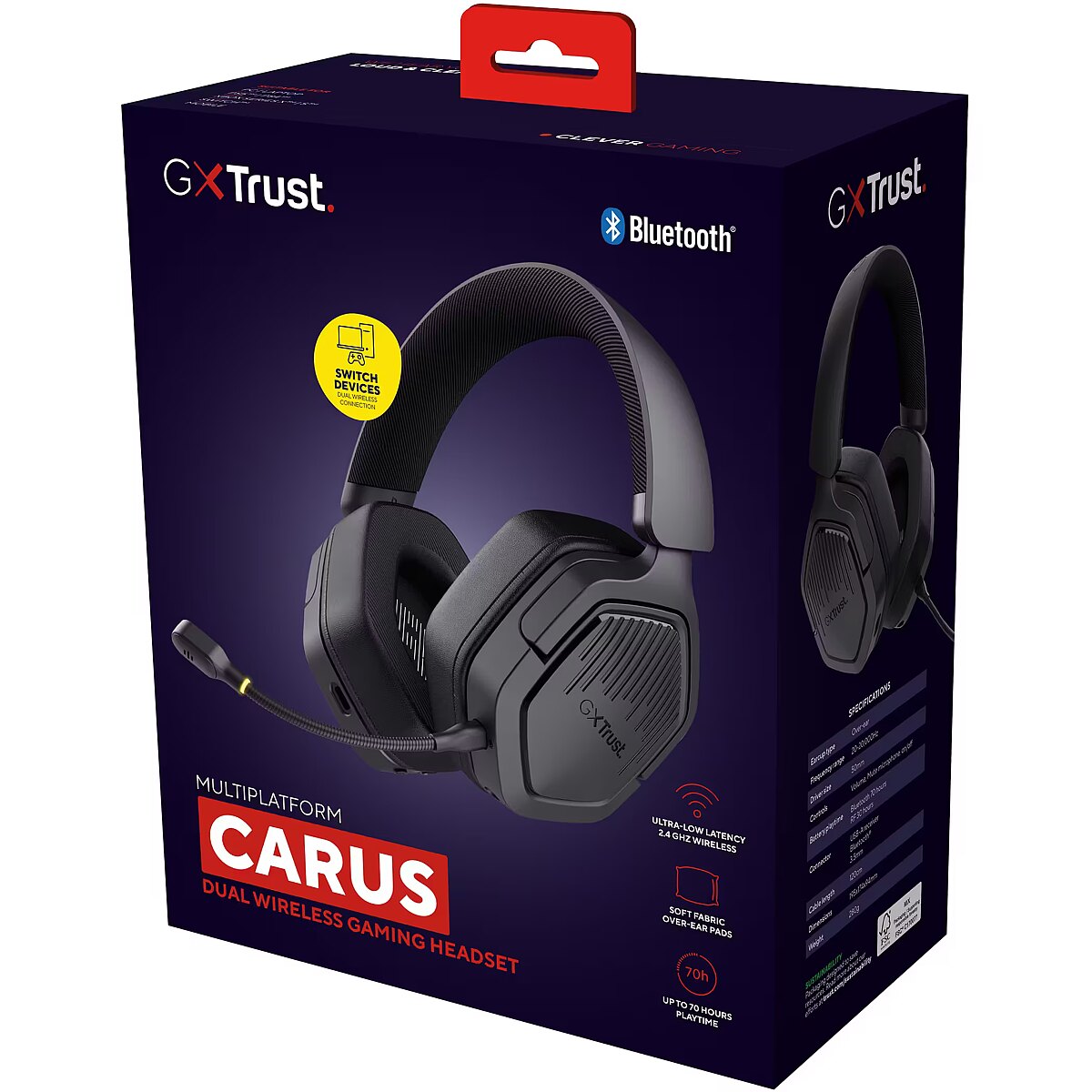 LongSummaryDescription - Trust GXT 493 Carus. Product type: Headset. Connectivity technology: Wired & Wireless, Bluetooth. Recommended usage: Gaming. Headphone frequency: 20 - 20000 Hz. Weight: 280 g. Product colour: Black