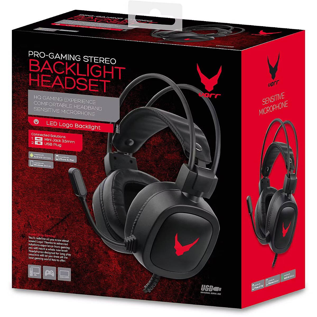 LongDesc - Rugged headphones for avid gamersReliable headphones for demanding players by Varr made of durable material. Comfortable, large square earpieces and a light, ergonomic design ensure comfort during long games.HIGH PARAMETERSLoud, expressive sound while playing is provided by 40 mm drivers. The purity of the sound is guaranteed by the high technical parameters of the headphones - frequency response and impedance. The advantage of the headphones is a durable, braided cable with a length of 2 m.CONNECTIVITY AT THE HIGHEST LEVELVoice control is facilitated by a discreet knob built into the headphones. The advantage of the headphones is also a modern gaming design and LED backlight.