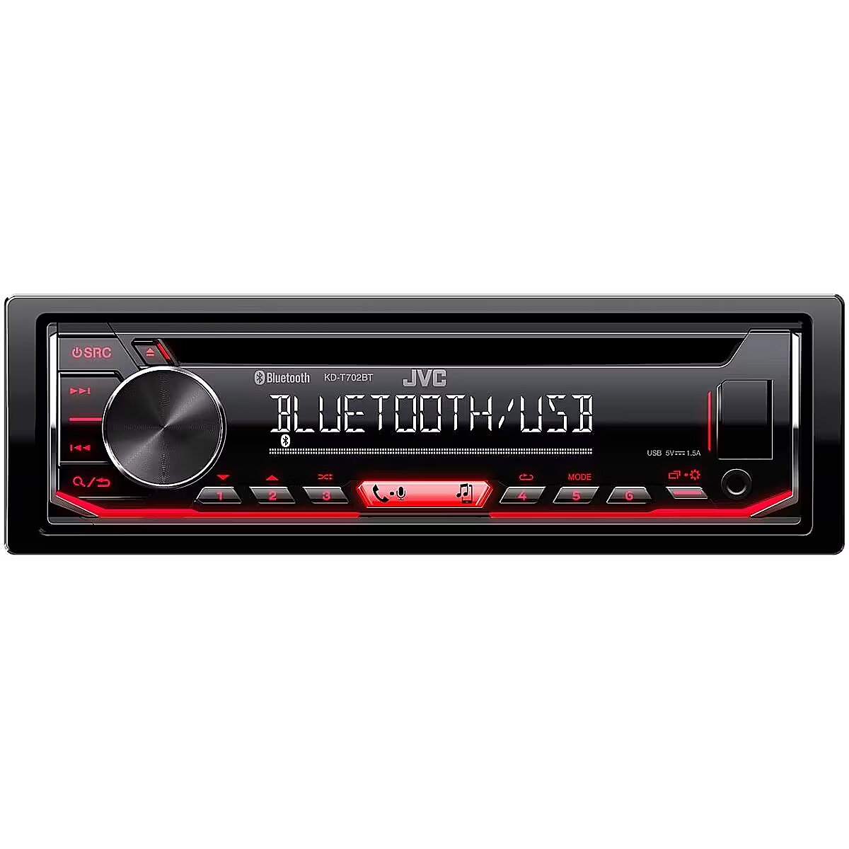 LongSummaryDescription - JVC KD-T702BT 1-DIN CD Receiver. Product colour: Black, DIN size: 1 DIN, Output power: 200 W. Display type: LCD, Illumination colour: White. Bluetooth version: 3.0+HS, Bluetooth profiles: A2DP, AVRCP, USB connector type: USB Type-A. Supported radio bands: AM, FM, LW, MW, FM band range: 87.5 - 108 MHz, AM band range: 531 - 1611 kHz. Width: 182 mm, Depth: 156 mm, Height: 53 mm