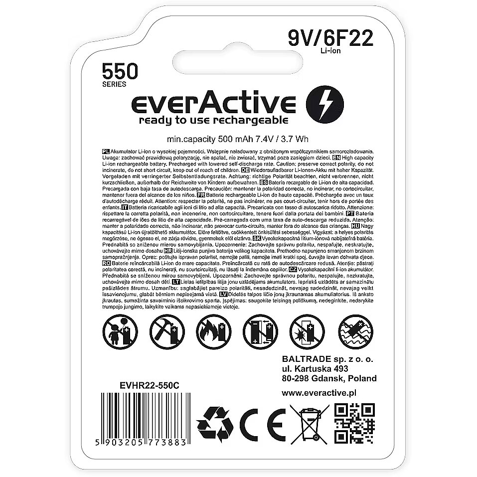 productName - Rechargeable battery everActive 6F22/9V Li-ion 550 mAh with USB TYPE C
