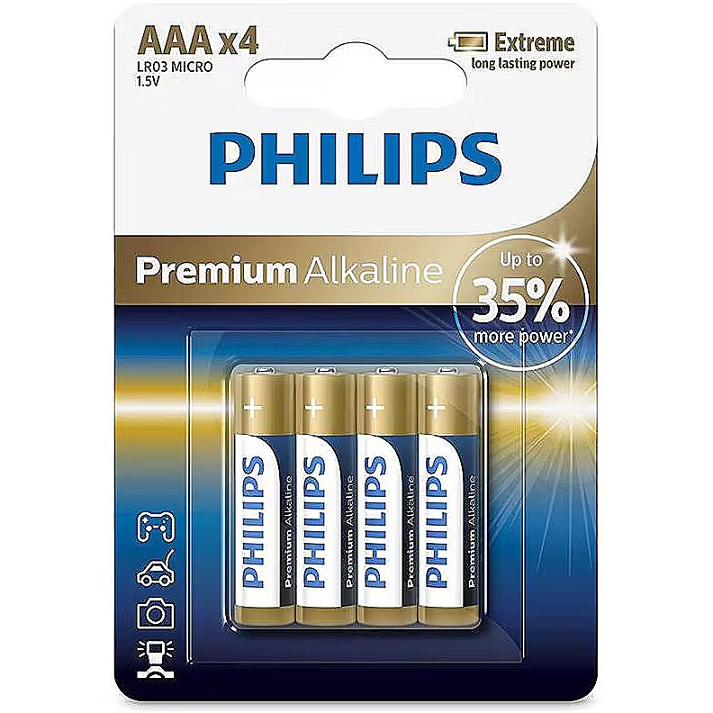 description_en - The Philips Premium Alkaline LR03M4B/10 single AAA batteries delivers dependable, long-lasting power for your everyday devices. Ideal for remote controls, wireless accessories, clocks, toys, and flashlights, it provides superior energy performance compared to standard zinc-carbon batteries. With leak-proof construction and up to 10 years of shelf life, Philips ensures quality and reliability whenever you need power.