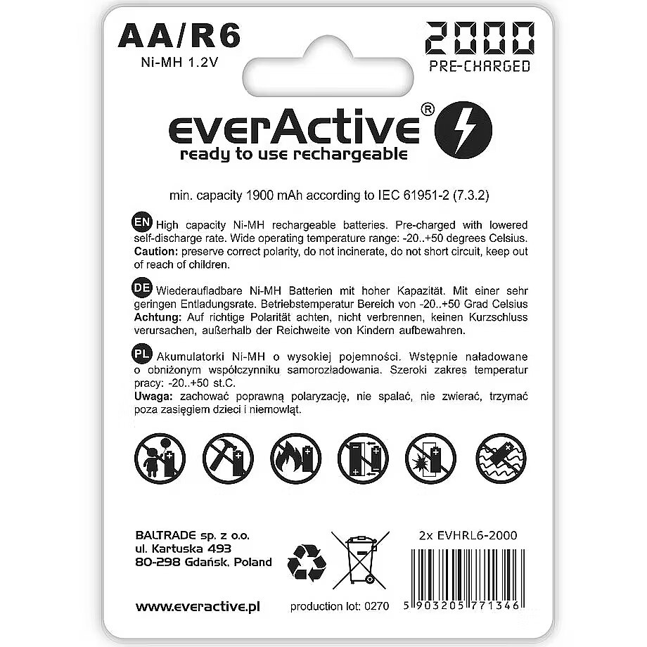 Description - 2 x innovative R6 AA 2000 mAh everActive battery made in "ready to use" technology. Silver Line series - the highest quality known from the Professional series, high capacity, surprisingly low price. Pre-charged - pre-charged.