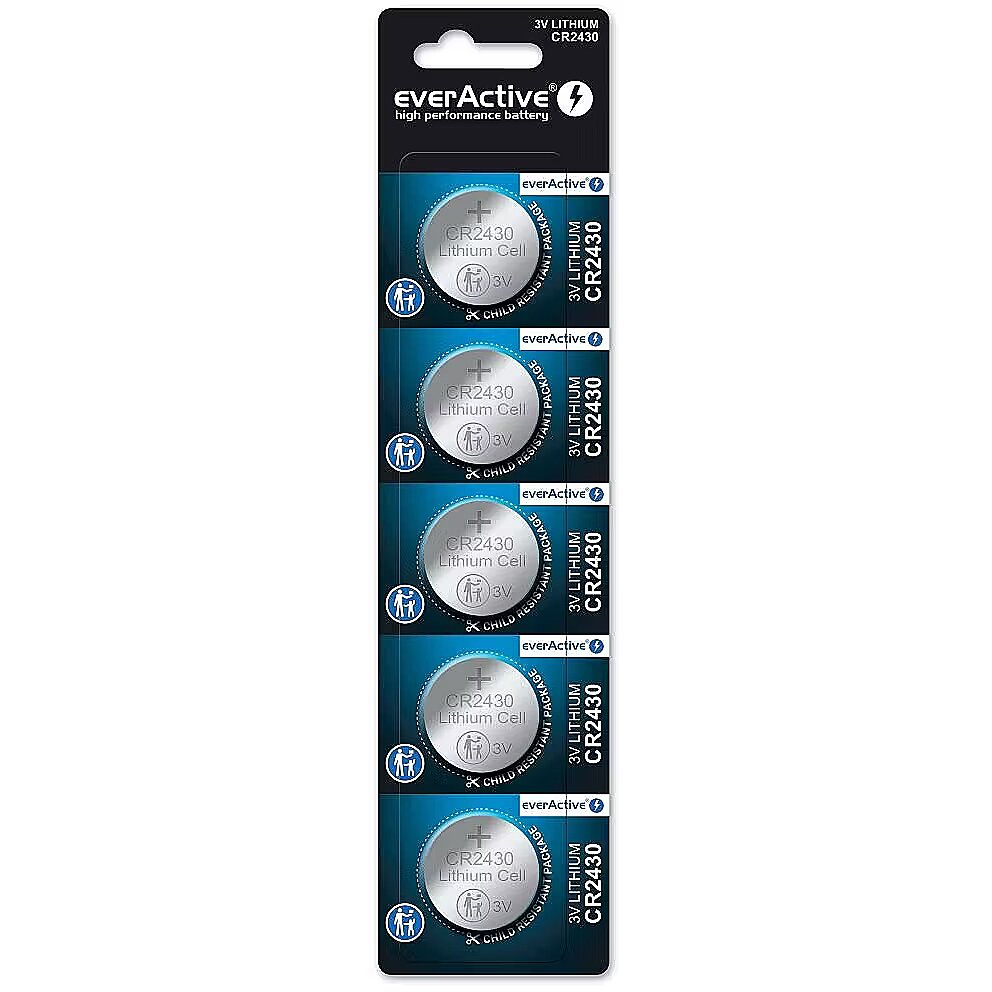 Description - EverActive CR2430 lithium battery - 5 pieces Button batteries have a very wide range of applications: - toys, calculators, music boxes, lamps, flashlights, LED decorations, pocket scales, bathroom scales, watches, bicycle computers, remote controls, measuring devices (e.g. electronic calipers, meters), medical devices (e.g. glucose meters), laser pointers, heart rate monitors , maintaining CMOS memory in computers and other devices and others.