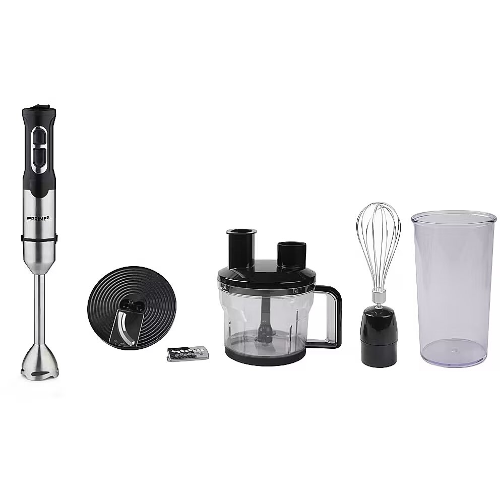 Description - SHB71 hand blender Hand blender with a quadruple blade, powered by a 1200 W motor. Powerful, quiet DC motor, 1200 W Smooth speed regulation Multi-tasking 4 in 1 Hand blender with a power of 1200 W with a mixer, beater and a cup with measuring cup included. A hand blender is an essential tool in every kitchen, providing not only convenience, but also the opportunity to creatively experiment with different flavors and textures. Its versatility means you can use it to prepare refreshing smoothies, velvety soups, creamy sauces and many other dishes. Thanks to the ease of use and precise speed regulation, the hand blender allows you to adjust the consistency of dishes to your individual preferences. This is an irreplaceable equipment for enthusiasts of culinary experiments and people who value speed and convenience in preparing meals. The SHB71 model by PRIME3 is a versatile hand blender, powered by a 1200 W engine. It is made of the highest quality materials, which guarantees durability and reliability. The ergonomic shape and comfortable rubberized handle make using the blender a real pleasure, and the intuitive buttons and illuminated knob allow for smooth speed regulation. Thanks to the quadruple stainless steel blade, you can chop and mix ingredients more effectively and faster. The SHB71 hand blender by PRIME3 is equipped with a mixer with a capacity of 1200 ml, which allows for even greater versatility in preparing dishes. The mixer has a handle and rubber base elements that ensure stability during operation and allow for comfortable and safe use. The biggest advantage of this accessory are three interchangeable graters - for slicing, grating with coarse holes and for grating potatoes into pancakes. Additional knives further increase the functionality of the food processor - turning it into a chopper. The set also includes a measuring cup that makes it easier to precisely measure ingredients. This is a practical solution that allows you to precisely use the right proportions in recipes, which is especially important when preparing dishes that require precision. Additionally, the blender is equipped with a beater that allows you to whip cream or egg whites into meringue. The SHB71 hand blender by PRIME3 ensures convenience, efficiency and the ability to prepare various dishes and drinks quickly and professionally. PRIME3 brand blenders are made of high-quality BPA (bisphenol A)-free materials. These materials are safe for health and do not react chemically with food.