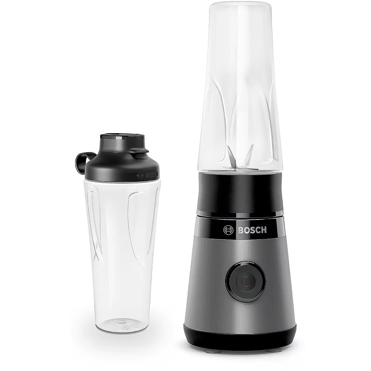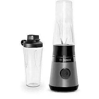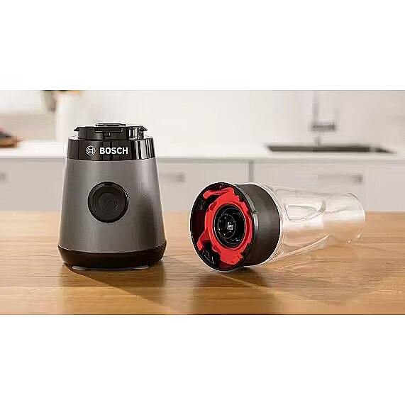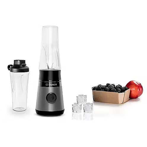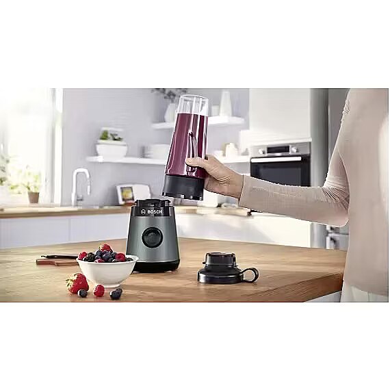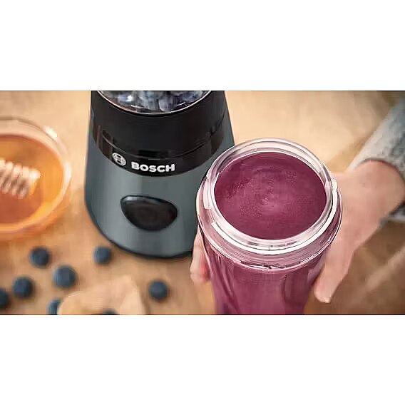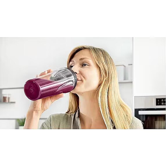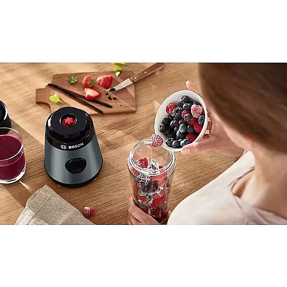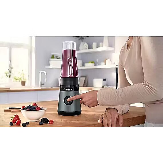 Description - Przygotuj doskonale gładkie smoothie. Doskonale gładkie smoothie przygotujesz bez wysiłku dzięki wysokiej prędkości blendowania (do 40 000 obr./min.), współdziałaniu mocnego silnika (450W), trwałym ostrzom i specjalnemu kształtowi ścianek kielicha, który optymalizuje przepływ składników. Oczekuj szybkiego, łatwego i bezwysiłkowego przygotowania koktajli nawet przy użyciu mrożonych czy twardych składników. Kremowe smoothies w kilka sekund. Przy użyciu mini blendera Bosch uzyskasz najlepsze rezultaty i pyszny koktajl czy smoothie tylko w 30 sekund. Doświadczenie firmy Bosch w produkcji urządzeń kuchennych od 1955 roku pozwoliło stworzyć wysokowydajny silnik o mocy 450 W i prędkości obrotowej do 40.000 obr./min. Możesz więc blendować i relaksować się bez obawy o przegrzanie silnika. Efektywne blendowanie dzięki trwałym ostrzom. Gładka konsystencja to zasługa wydajnych ostrzy. Ostrza ProEdge ze stali nierdzewnej są niezwykle trwałe. Krawędzie ostrzy zostały wzmocnione, co zapewnia im długotrwałą wytrzymałość. Beztrosko ciesz się koktajlami, które możesz zabrać ze sobą z domu. Oszczędzaj czas blendując koktajle bezpośrednio w butelce ToGo. Bezpieczeństwo gwarantuje ochrona przed wylaniem płynu z butelki tzw. SafeLock. Jest to unikalny mechanizm, który zapobiega przypadkowemu otwarciu butelki i zalaniu jednostki napędowej podczas wyjmowania butelki z napędu. Pokrywa butelki ToGo jest również dodatkowo uszczelniona i zapewnia ochronę przed wylaniem płynu z butelki podczas podróży. Wygodny system montażu butelki. Łatwość utrzymania w czystości. Komfort od początku do końca. Dzięki odkręcanej butelce ToGo montaż jest tak prosty jak to tylko możliwe i zakończony wyraźnym kliknięciem. Czyszczenie jest również wygodne i szybkie dzięki elementom nadającym się do mycia w zmywarce.