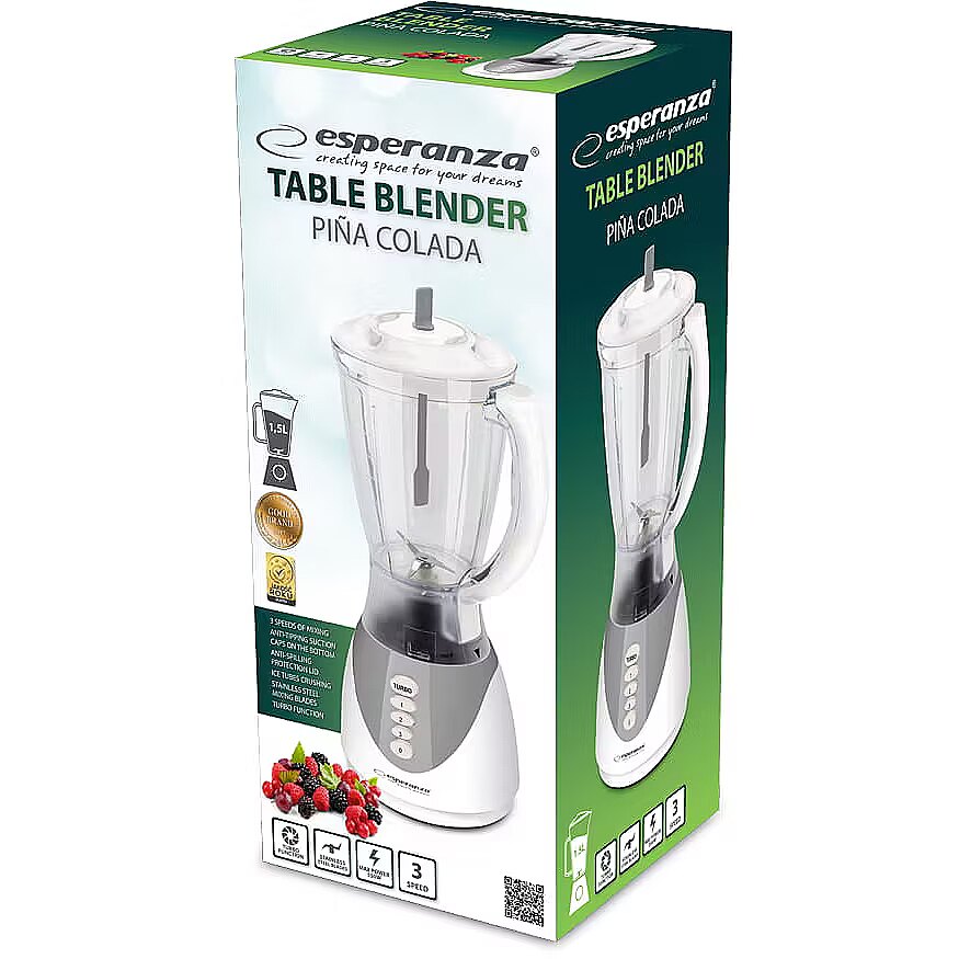 Description - Esperanza table blender is specially designed for  blending fruits, vegetable and making cocktails, shakes, smoothie. Thanks to the strong powered engine, it can also be suitable to crush small ice tubes. Its your  best accompany to get healthy, fresh and tasty drinks. Bon Appetite!  Power: 350w  1,5 L food grade plastic jug  3 speeds of mixing  Anti-tipping suction caps on the bottom  Anti -spilling protection lid  Ice tubes crushing  Stainless steel mixing blades  Turbo function  Cable : 2*0.75MM *  1.0 M  Jug, lid, stick can be washed in dishwasher.