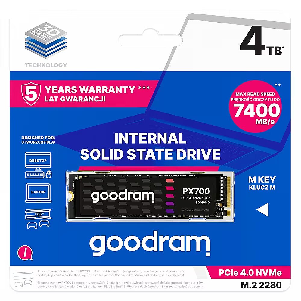 LongDesc - The Goodram PX700 drive is the latest solution for the most demanding users looking for reliable memory with the fastest fourth generation interface. It is thanks to the PCIe 4 x4 standard that the drive can reach speeds of up to 7,400 MB/s. The performance of the PX700 drive is sure to be appreciated by gamers, computer graphic designers and professionals who handle large video and photo files.The new Goodram PX700 is ideal for users who want to increase the performance and responsiveness of their computer or laptop. It is also great for gamers who need more space for data and games in their PlayStation™ console. The PX700 drive’s blazing fast read and write speeds directly translate into smooth performance, fast loading of games and applications, and faster operations. The high read and write speeds are almost double those of the previous generation of drives, and in addition the speed of Goodram’s latest solution utilises the maximum capabilities of the fourth generation of drives.The Goodram PX700 SSD is available in a wide range of capacities: from 512 GB to as much as 4 TB, allowing you to perfectly match the drive to your needs.Maximum performance from the fourth generationTaking full advantage of the capabilities of the most popular generation of SSDs, read speeds of up to 7,400 MB/s for reading and 6,500 MB/s for writing can be achieved. Until recently, similar values were reserved only for the most expensive solutions available on the market.Faster speed, longer life – discover more!The Goodram PX700 uses HMB 3.0 technology, known as Host Memory Buffer, for memory management, which enables efficient allocation of individual memory bits using the computer’s operating memory. HMB 3.0 guarantees stable and lightning-fast data read and write speeds, resulting in faster application launches and lightning-fast game and file loads. Thanks to the Host Memory Buffer, data is available at all times without delay, which is extremely important when using demanding applications and advanced software. In addition, the Goodram PX700 is capable of optimised power management, resulting in lower power consumption, which in turn extends laptop uptime, which is important for mobile users.Your data securityA high TBW (Total Bytes Written) level of up to 2,400 TB is a very important indicator of the Goodram PX700 SSD. TBW is a measure of a drive’s durability and lifespan, which indicates the total amount of data that can be written to an SSD over the entire warranty period before the drive reaches its theoretical limits. The higher the TBW rating, the more durable the media is, and the less prone to failures due to intensive writing and reading of data. TBW is particularly important in professional applications and when there is a need for intensive writing of large file sizes.Forget the limitations and enhance the user experienceThe Goodram PX700 PCIe Gen 4 x4 NVMe drive is the flagship of the latest generation of drives, boasting unparalleled performance and versatile compatibility. With its universal format, the PX700 drive is ideal for a variety of applications where speed, performance and data throughput are critical.The PX700 is the perfect solution for desktops, workstations and laptops, especially those used for graphics, video editing and advanced entertainment. It provides extremely fast data transfer rates, reduced loading times for games and applications and enhanced overall PC performance.Broad compatibilityIn addition, the PX700 drive meets the most stringent memory expansion requirements of PlayStation™ consoles, which come with a limited amount of memory from the factory. This limitation makes it difficult to comfortably store more games and affects the convenience of using the console. The use of the PX700 SSD significantly improves the quality and performance of gameplay while enhancing the console experience.Temperature under controlThe Goodram PX700 SSD features a low-profile heatsink made from graphene. This material is one of the best thermal conductors. The graphene heatsink is excellent at dissipating the heat generated by the SSD components, helping to keep the SSD at the right temperature. Ensuring optimal temperatures is key, as lower temperatures affect the stability of the PX700 drive and increase its lifespan.Thanks to an efficient cooling system, the Goodram PX700 drive has minimal throttling, or performance degradation caused by overheating. This guarantees maximum performance even during intensive use.Up to 5 year warranty!The PX700 SSD is covered by up to 5 years of manufacturer’s warranty. All available capacities are limited by the same warranty period.