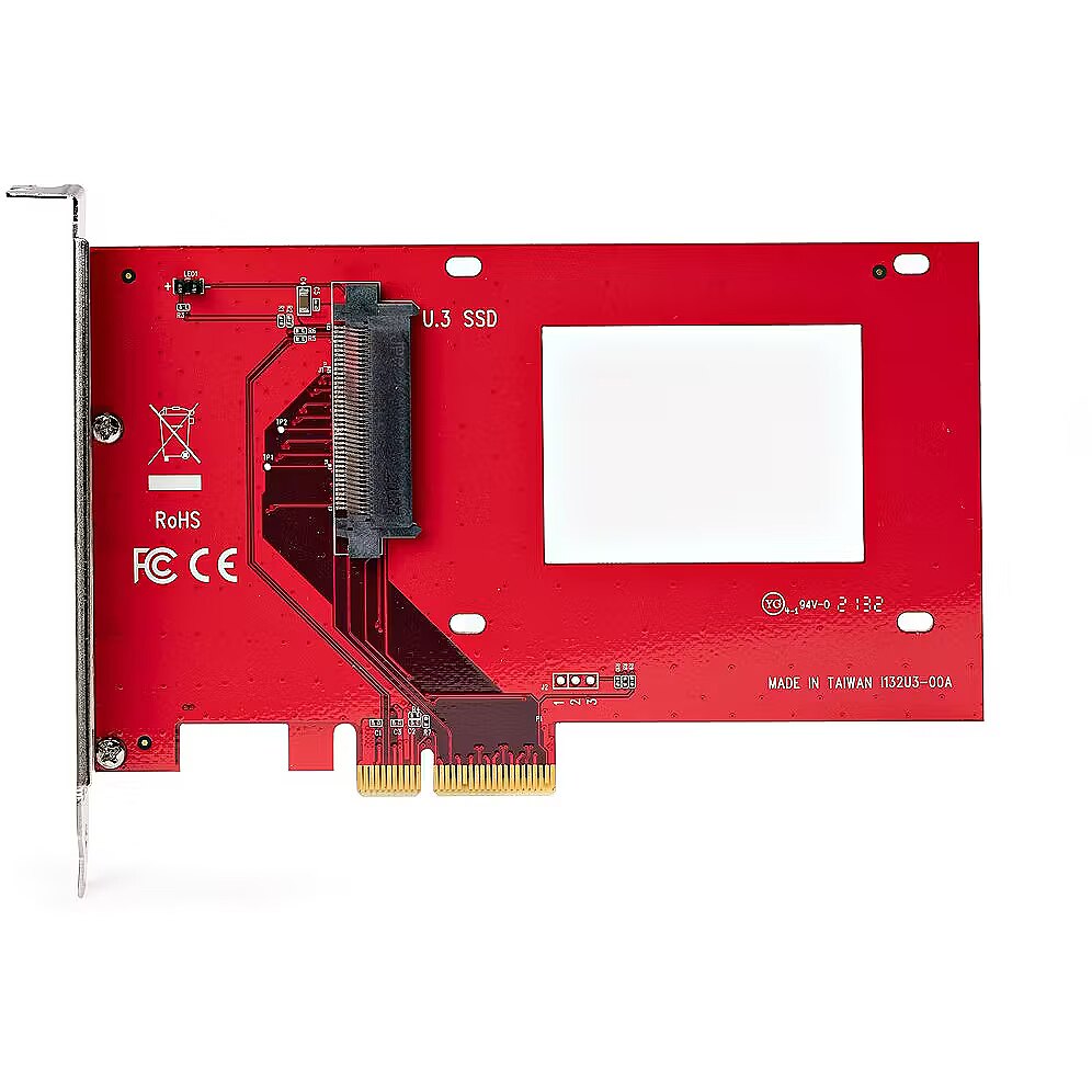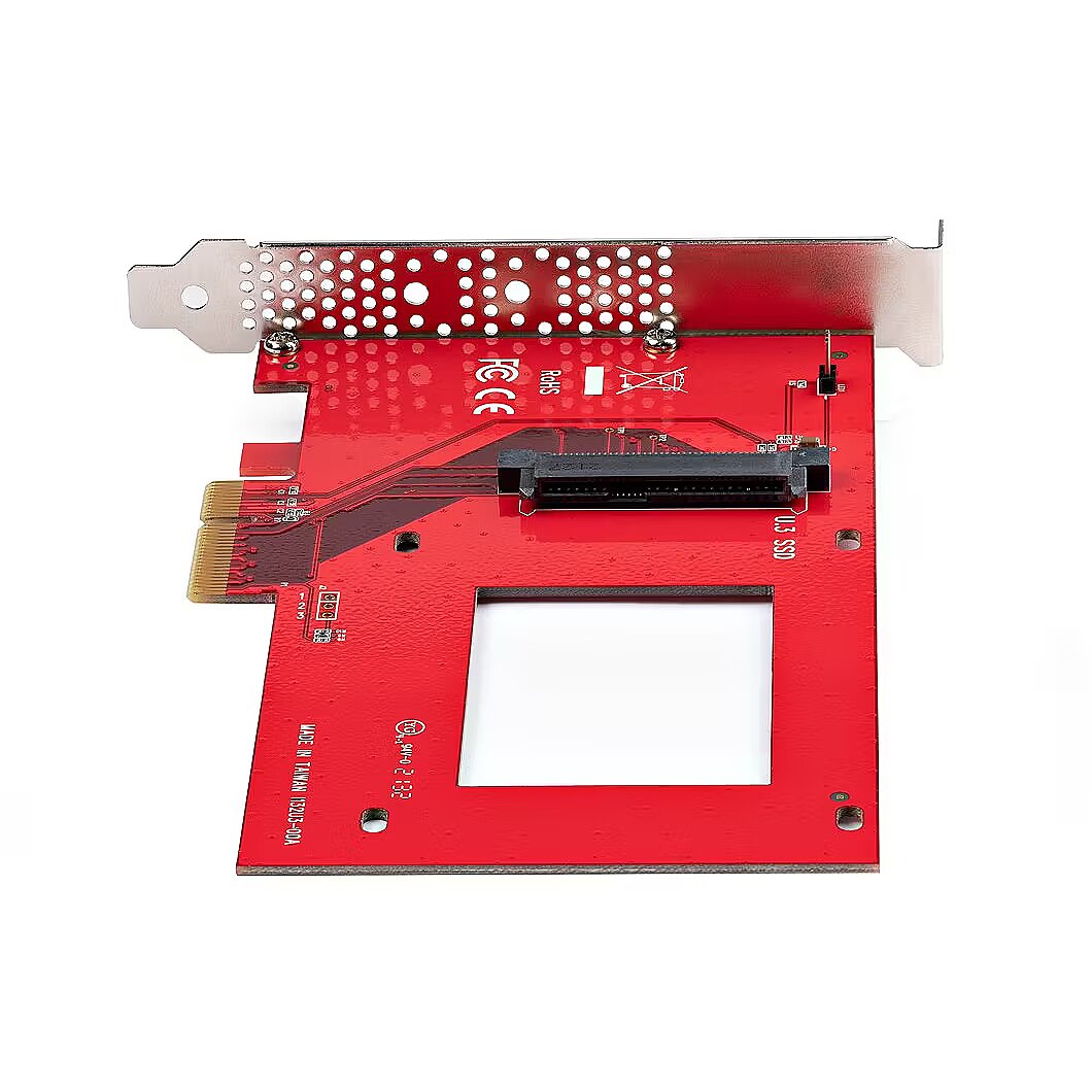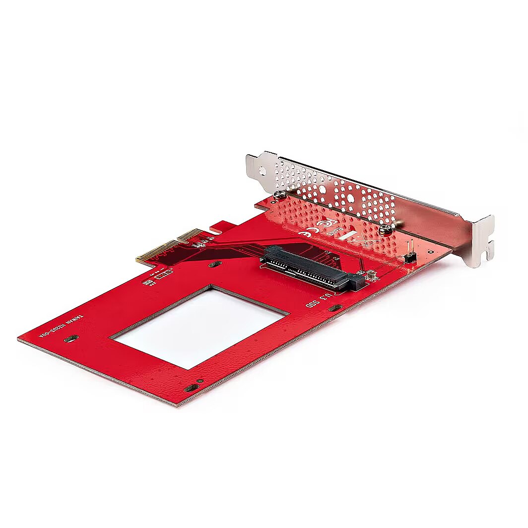 LongSummaryDescription - StarTech.com U.3 to PCIe Adapter Card, PCIe 4.0 x4 Adapter For 2.5" U.3 NVMe SSDs, SFF-TA-1001 PCI Express Add-in Card for Desktops/Servers, TAA Compliant - OS Independent. Host interface: PCIe, Output interface: U.3. Product colour: Red, LED indicators: Activity, Power, Mean time between failures (MTBF): 21693912 h. Supported storage drive heights: 5,7,9.5,12.5,15 mm. Width: 90 mm, Depth: 154 mm, Height: 1.5 mm. Package width: 215 mm, Package depth: 155 mm, Package height: 30 mm