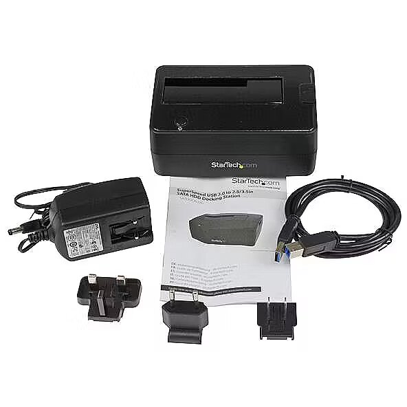 LongSummaryDescription - StarTech.com Single Bay USB 3.0 to SATA Hard Drive Docking Station, USB 3.0 (5 Gbps) Hard Drive Dock, External 2.5/3.5" SATA I/II/III HDD/SSD Docking Station, Top-Loading Hard Drive Bay. Storage media type: HDD, SSD, Storage drive interface: Serial ATA, Serial ATA II, Serial ATA III, Storage drive sizes supported: 2.5,3.5". Host interface: USB 3.2 Gen 1 (3.1 Gen 1) Type-B. Product colour: Black, Material: Plastic, Maximum data transfer rate: 5 Gbit/s. AC input voltage: 110-240 V, Output voltage: 12 V, Output current: 2.5 A. Windows operating systems supported: Windows 2000, Windows 2000 Professional, Windows 7 Home Basic, Windows 7 Home Basic x64, Windows 7..., Mac operating systems supported: Mac OS X 10.6 Snow Leopard, Mac OS X 10.7 Lion, Mac OS X 10.8 Mountain Lion, Mac OS X 10.9 Mavericks