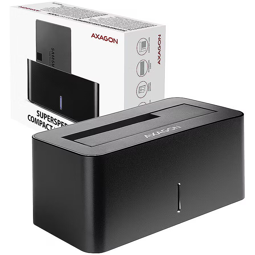 Description - ADSA-SN SuperSpeed USB COMPACT HDD dock Compact USB 3.2 Gen 1 docking station for 2.5" and 3.5" SATA HDDs/SSDs. SuperSpeed USB AXAGON ADSA-SN COMPACT HDD/SSD DOCK docking station easily and quickly connects any SATA disk to your computer. A handy helper for the easiest and fastest way of connecting SATA disks to your computer - just plug the disk into the base. Automatic installation can be done even by the layman. SATA 6G interface with UASP support allows you to enjoy the speed of modern SSD disks. The TRIM feature support limits the gradual degradation of SSD performance over time. Reading of S.M.A.R.T. information monitoring the condition of the connected disks. Supports sleeping of both the connected disks and station. Low laid centre of gravity of the docking station for good stability. Rubber feet to reduce vibrations. Modern minimalist design of housing with aluminium casing.
