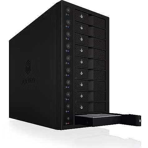 Technical_details - Type: Drive Enclosure Color: Black EAN: 4250078171188 Manufacturer number: 60780 Material: steel, plastic Suitable for: PC system Drive bays: 10 pieces Connections: 1x USB-C 3.2 Gen 2 (10 Gbit/s) : SATA : The designation USB 3.2 Gen 2 corresponds to the former designation USB 3.1 Gen 2 / USB 3.1. Front: LED for: power, disk in use and access Rear: Host interface: USB 3.1 (Gen 2) with up to 10 Gbit/s, on/off switch, power connector, power supply fan Notes: Enclosure for 10x 3.5" SATA I, II, III (6 Gbit/s) drives, energy-saving thanks to automatic stand-by mode, EASY swap, easy handling thanks to carrier-free hard disk installation, UASP support, supports SINGLE mode - each Drive is controlled separately, hard disks can be switched on and off individually without disconnecting, plug & play and hot swap Compatible with: MacOS, Windows Accessories: 1x power cable, 1x USB Type-C to Type-C cable, 1x USB Type-C to Type-A cable, 2x keys, 1x manual Dimensions: Width: 180mm x Height: 335mm x Depth/Length: 385mm Weight: 6.6kg