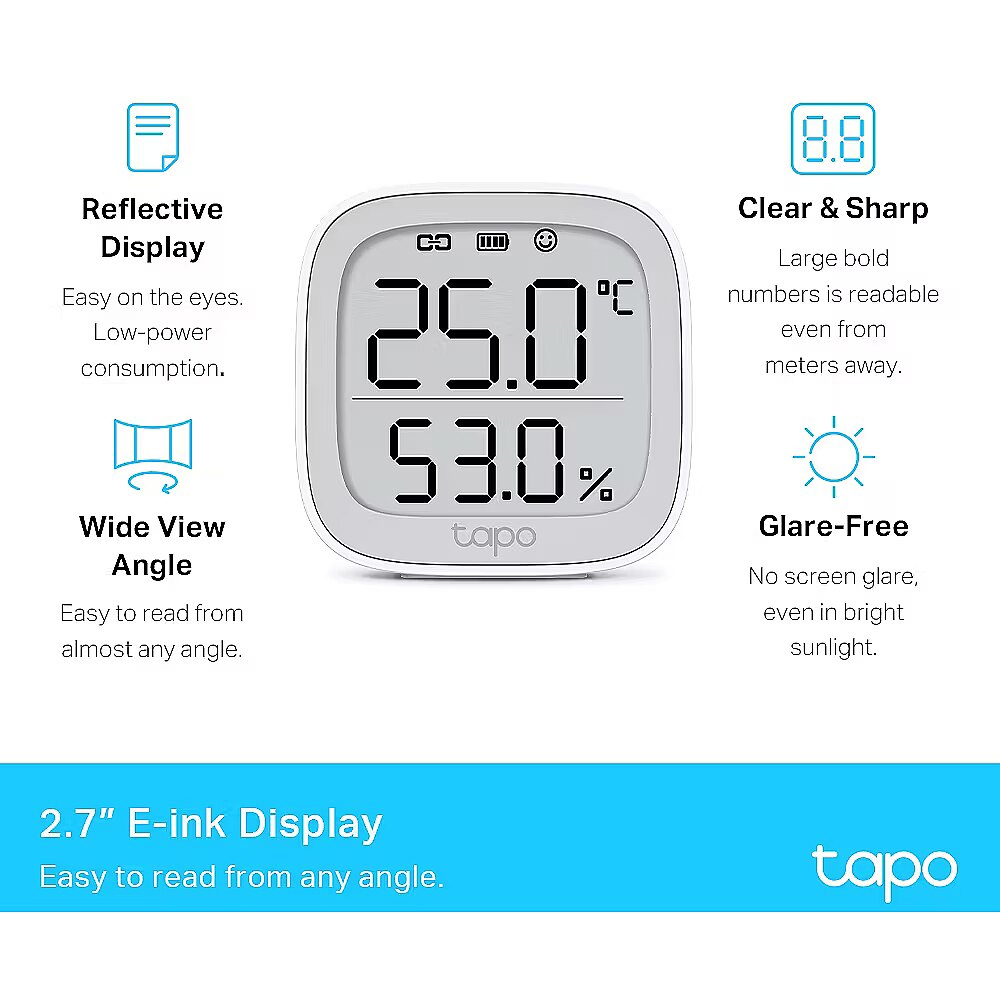 LongDesc - Tapo Smart Temperature& Humidity Monitor- Clear & Sharp E-Ink Display- Real-time App Notifications- Free Data Storage & Export- Work with Tapo devicesE-ink Display, clear and sharp from any angle.Features a 2.7” E-ink display that reads like real paper. No screen glare and daylight readable with a 180 degree viewing angle. - High-Accuracy Sensor– Features the Swiss-made sensor chip with real-time data updating every 2s.- 2.7“ E-Ink Display – No screen glare and readable in bright sunlight with a 180° veiwing angle.- Real-Time Notifications – Send you notifications via Tapo app whenever temperature or humidity levels fall outside customized ranges.- Smart Actions Support – Connect the actions with other smart devices for home automation.- Data Storage & Export – Up to 2 years’ free cloud data storage, and export at any time.- Comfort Level Indicator – Keep an eye on your home’s levels at a glance. Customize your comfort zones in the Tapo app.- Switchable Dispaly Unit – One press to switch the temperature unit.- 2 Year+ Battery Life – Battery-powered design and lasts for up to two years with 2 AAA batteries.- Easy Installation – Place it anywhere with multiple installation options.- Device Sharing – Easily share management permissions with each member of your family.- Easy Setup and Use – Set up quickly and easily through the free Tapo app.