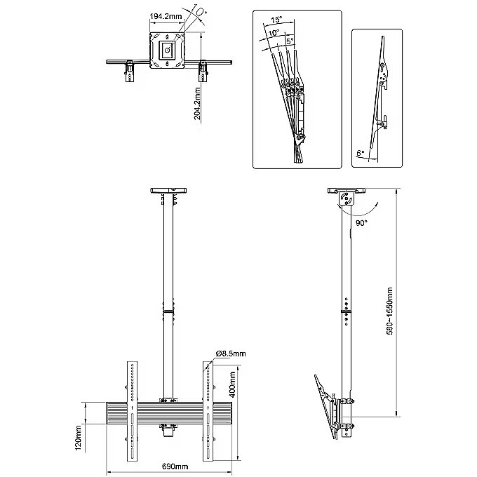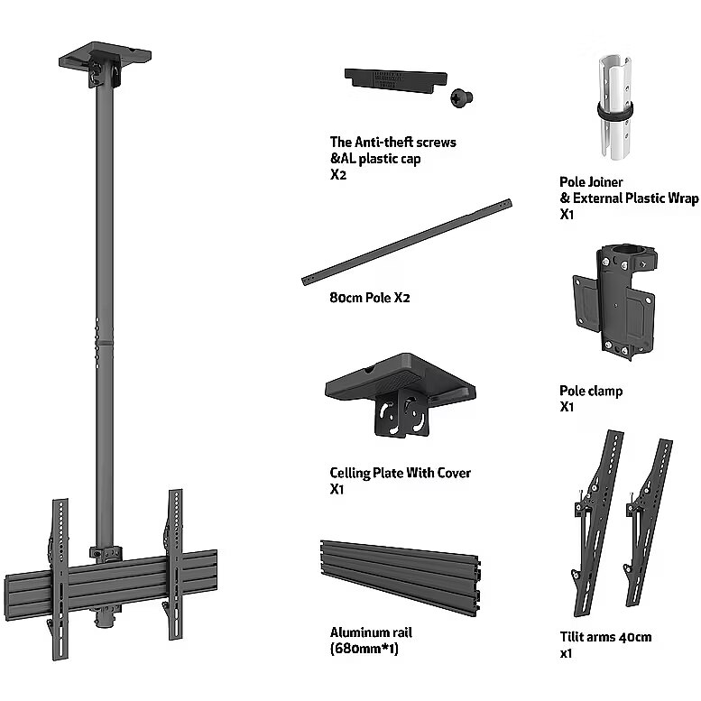 LongSummaryDescription - Multibrackets M Ceiling Mount Pro MBC1U. Maximum weight capacity: 50 kg, Minimum screen size: 101.6 cm (40"), Maximum screen size: 165.1 cm (65"), Minimum VESA mount: 100 x 100 mm, Maximum VESA mount: 800 x 600 mm. Height adjustment range: 580 - 1550 mm, Tilt angle range: 0 - 15°, Swivel angle: 360°. Product colour: Black