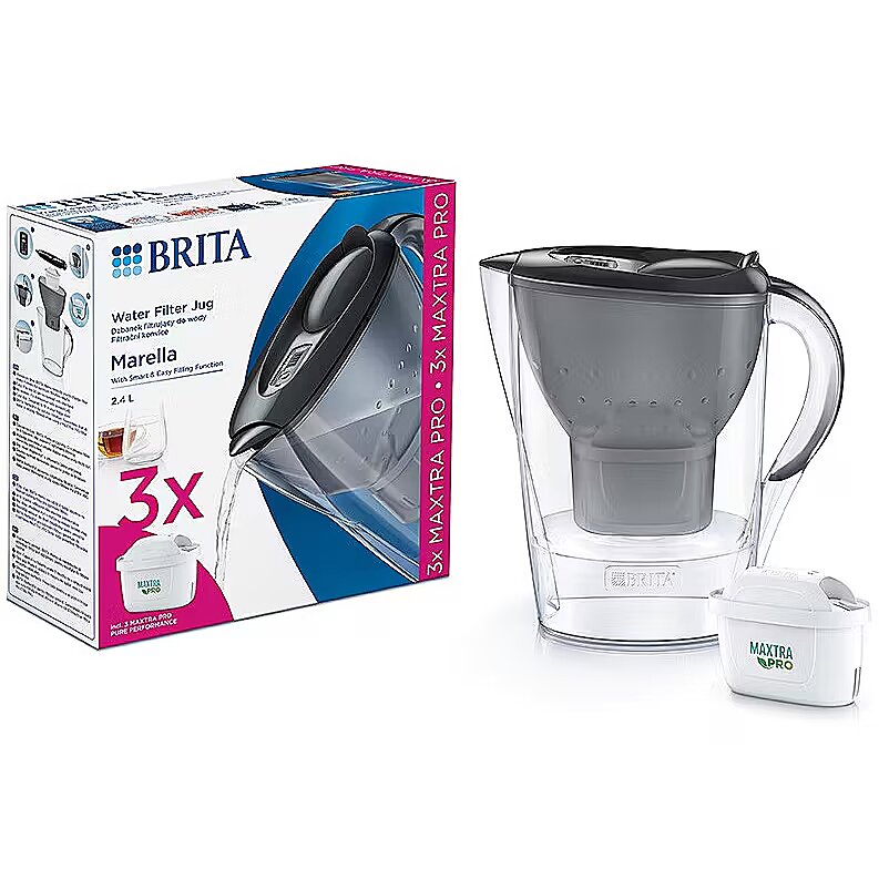 Description - BRITA Marella Water Filter Pitcher 2.4L + 3 PRO Pure Performance Cartridges The Perfect Water Filter Pitcher for Your Family The BRITA Marella water filter pitcher is the best solution for your household. With it, you can enjoy cleaner, freshly filtered water every day. Say goodbye to expensive bottled drinks, and making sure you stay hydrated will be even easier! Constant access to fresh, filtered drinking water. Improved taste of prepared dishes and beverages. Reduced limescale buildup in your kettle and coffee maker. Easy filling system and reminders for cartridge replacement. Significant savingsfiltered water costs just a few cents per liter. Convenience and Functionality The BRITA water filter pitcher is designed for your everyday comfort. Its an ergonomic and functional device that should be a staple in every kitchen. Large capacity of 2.4 liters total, with 1.4 liters of filtered water. Easy filling: the lid with a flip top can be opened with one hand. Dishwasher safe (except for the lid with the electronic indicator). BRITA Memo indicator reminds you to replace the filter every 4 weeks. Fits perfectly on the refrigerator door shelf. Compact dimensions. Thorough Filtration Thanks to the advanced MAXTRA PRO Pure Performance water filter with innovative BRITA MicroFlow technology, this pitcher ensures unmatched water purity, regardless of its hardness. Whether you crave hot coffee or cool lemonade, you can enjoy clean, fresh water any time of day. This filter allows you to discover the true taste of water that will delight your taste buds. The MAXTRA PRO Pure Performance filter is sufficient for filtering 150 liters of water. How Does the BRITA MAXTRA PRO Pure Performance Filter Work? Filtration through the BRITA MAXTRA PRO Pure Performance is a 4-stage process: Super fine mesh: Captures large particles from old water pipes, such as sand or rust. Natural activated carbon pearls, made from coconut shells, prevent chlorine and its derivatives, as well as trace contaminants like herbicides, pesticides, and pharmaceutical residues (if present in tap water) from passing through. Ion exchange pearls reduce metals like lead and copper and soften the water. An additional high-efficiency filter mesh ensures 4x better pollutant retention compared to the previous MAXTRA+ filter. Enhance Your Kitchen The BRITA Marella water filter pitcher will transform your kitchen for the better! Not only will you rediscover the taste of purified tap water, but youll also prepare tastier cold and hot beverages. Coffee will regain its deep aroma, and tea will be clear and transparent. By using delicious filtered water, the dishes you prepare will be even better and healthier for you and your family. Design in 3 Colors Love colors? So do we! Thats why the BRITA Marella comes in 3 unique colors, allowing you to match the pitcher to your preferences and perfectly fit it into your kitchen style. You can choose from deep graphite, vibrant blue, or pure white. The BRITA water filter pitcher offers not only high quality but also modern design that will appeal to everyone. Safety First All BRITA products, including filter pitchers, have received a positive Hygiene Certificate from the National Institute of Public Health (PZH). With thorough testing, you can be sure youre using safe water filters. Every sip of water from a BRITA pitcher is a healthy and tasty refreshment for you and your family. Choose BRITA Filter Pitchers and Protect the Planet By choosing filter pitchers, you protect the environment. With constant access to clean, freshly filtered water, you can forget about heavy packs of bottled water. Youll reduce the amount of plastic waste, contributing to the protection of our planet. Join us in caring for the environment. Give BRITA Filters a Second Life! By using original BRITA filter cartridges, you can care for the environment and join the #RecyclingWithBRITA club. This special program collects used cartridges initiated by BRITA gives filters a second life! Collect 6 used MAXTRA PRO or MicroDisc cartridges and send them back to BRITA Polandin return, youll receive a new cartridge! For more information, visit brita.pl. Give BRITA Filters a Second Life!