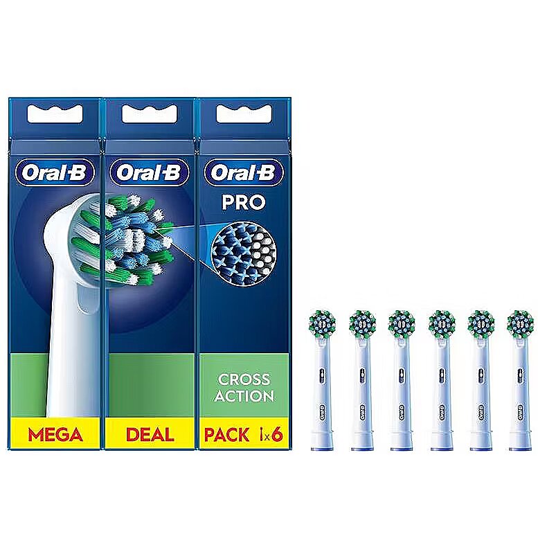MediumDescription EN - The Oral-B Pro Cross Action toothbrush head contains over 2200 bristles set at perfect angles, compared to a regular toothbrush, removing up to 100% more bacterial plaque and ensuring cleaner teeth & healthier gums. Oral-B original brush heads are designed with new X-shaped bristles that clean areas where round bristles can't reach. The usage indicator on this brush head changes from green to yellow, indicating when to replace the brush head for 100% cleaning effectiveness. Guaranteed compatibility with all Oral-B rechargeable electric toothbrush handles, except Pulsonic & iO toothbrushes. • Removes up to 100% more bacterial plaque in hard-to-reach areas compared to a regular toothbrush, ensuring cleaner teeth and healthier gums.