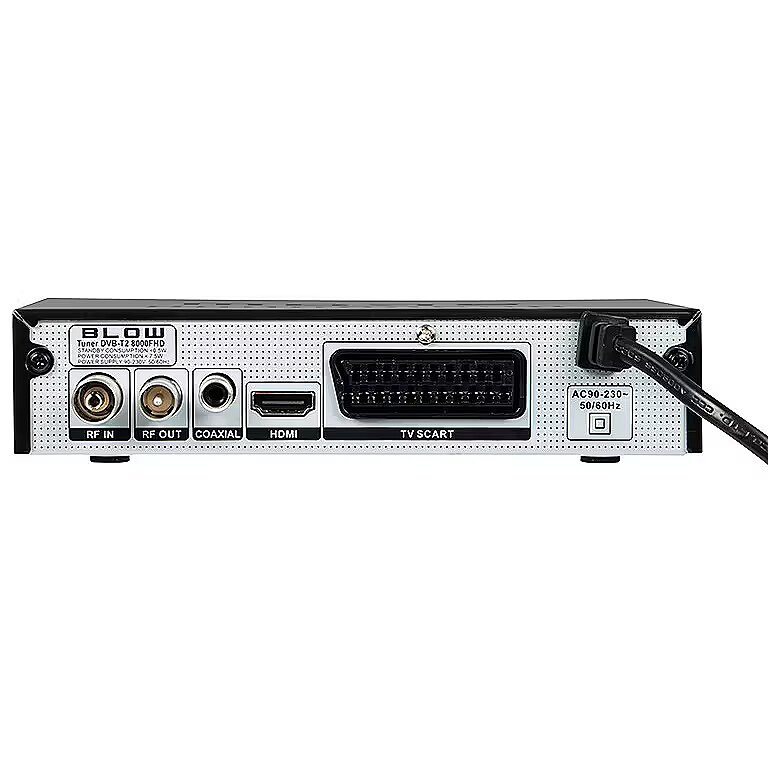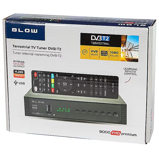 Description - Dekoder tuner DVB-T2 8000FHD Premium Wysokiej jakości dekoder do odbioru programów cyfrowych telewizji naziemnej BLOW DVB-T2 8000FHD PREMIUM. Urządzenie wyposażone zostało w szereg praktycznych funkcji oraz estetyczny, numeryczny wyświetlacz. Istotną funkcją w tym dekoderze jest obsługa formatun H.265 HEVC, dzięki czemu gwarantuje prawidłowe działanie także po wprowadzeniu zmian standardu kodowania. Tylko Dobry dekoder zagwarantuje odbiór wszystkich niekodowanych programów cyfrowej telewizji naziemnej! Odbiera programy telewizyjne nadawane w wysokiej rozdzielczości Full HD 1080. Podłączenie tunera do każdego rodzaju telewizora dzięki złączu HDMI. Dekoder wyposażony jest w bardzo czułą głowicę. Wskaźniki ustawienia sygnału umożliwiają prawidłowe ustawienie anteny.