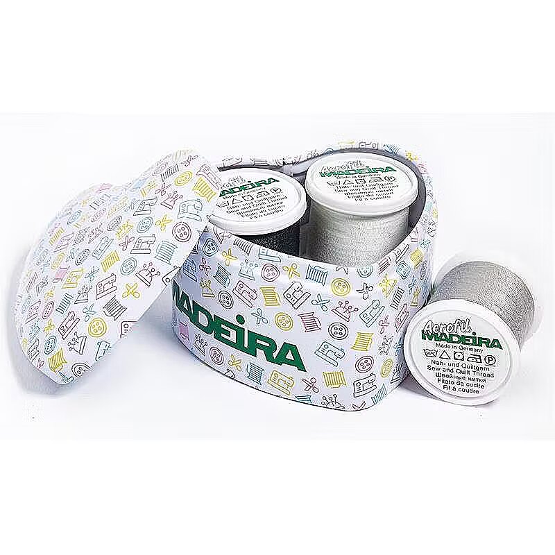 MediumDescription EN - Sewing thread set, 3 spools - white, grey, black. Each spool contains 100m of thread. Packaged in a heart-shaped metal box, which can later be used to store sewing accessories or other "treasures".