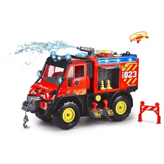 Fire truck licensed by Mercedes-Benz model Unimog U530. Water cannon rotated by means of a rod, with a range of up to 3 m. Large water tank allows shooting up to 400 times. Battery-powered function to launch the drone to fly up to 2 m high. The set includes 2 drones, a winch controlled by rods, light and sound function. OFFICIAL MERCEDES UNIMOG U530 FIRE TRUCK: licensed, toy fire truck meticulously reproduces a full-size car designed based on the international rescue vehicle. IMPRESSIVE LIGHTING AND REAL SOUNDS - 4 headlights on the hood and 4 on the roof and 2 light beams along the trailer and additionally 2 realistic sound effects will provide the child with authentic impressions. WATER CANNON - Water cannon rotated with a rod, with a range of up to 3 m, the built-in large water tank allows you to shoot up to 400 times. 2 DRONES FLY HIGH just press the button on the trailer to launch the drones to fly up to 2 m high. DURABLE CONSTRUCTION: the solid body of the car is made of metal, so the vehicle is impact resistant and will meet even the most demanding toddlers, it has an opening storage compartment on the side of the vehicle. FOR ALL CONDITIONS: durable, rubber tires with tread will ensure that the vehicle moves easily on any surface. MANY FUN POSSIBILITIES: this premium model is equipped with a winch controlled by rods is a great gift for every lover of playing fireman, runs on batteries: 4x1.5V R06 / AA (included), length 50 cm intended for children from 3 years of age. Dickie Toys Large Fire Rescue Unit Look out, the firefighters are coming! Many children dream of becoming a firefighter. This professional Fire Rescue Unit set from Dickie Toys with full equipment is a great way to introduce your child to the world of fire rescue and fulfill their big dreams. In addition, the vehicle has a realistic water cannon, sound signal and lights on the roof, which provide visibility in the dark. The set includes the required batteries (4x 1.5 V AA), so your child can start playing immediately after unpacking.