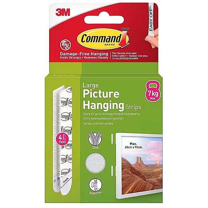 description_en - The 3M Command Strips in large size are built for heavy-duty mounting with no wall damage. Each set holds securely up to 7 kg, making them perfect for larger frames, artwork, and décor items. With their subtle white finish, these medium strips blend seamlessly into most backgrounds, ensuring a neat and discreet look. No tools, screws, or nails are needed—simply press to apply. When removed, they leave behind no marks, holes, or sticky residue, making them a convenient and reliable choice for both home and office spaces. Large size for heavier frames and décor items Holds up to 7 kg securely Works on painted walls, tile, metal, and wood Removes cleanly with no wall damage Tool-free application—no screws or nails required Each set includes 4 pairs (8 strips in total)
