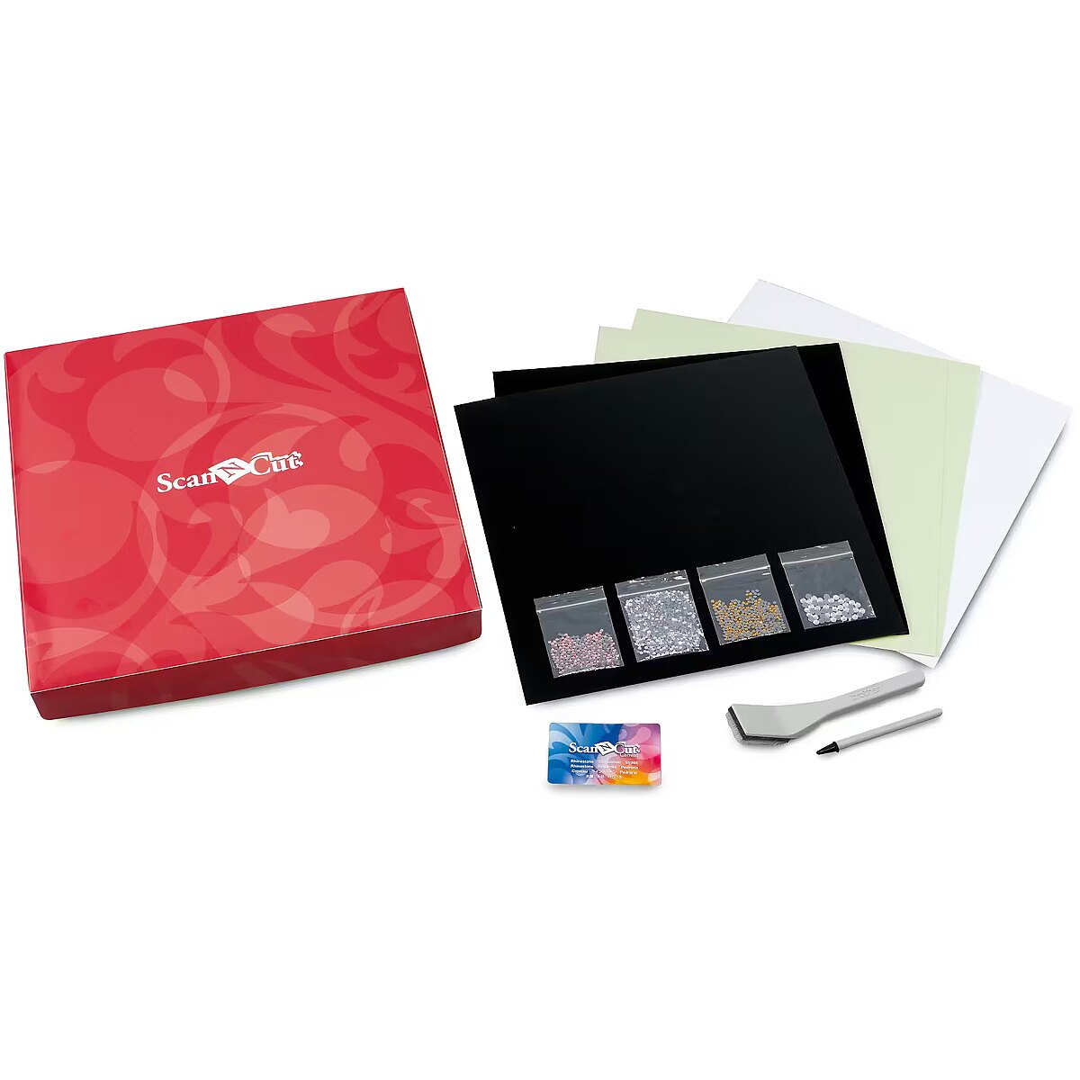 MediumDescription EN - Includes: 2 Template Sheets, 2 Transfer Sheets, Positioning Brush, Backing Board (reusable), Pick-up Tool, 1,450 Total Hot Fix Rhinestones (various colors and sizes), Instruction Guide, and ScanNCutCanvas activation card for the Rhinestone Function.
