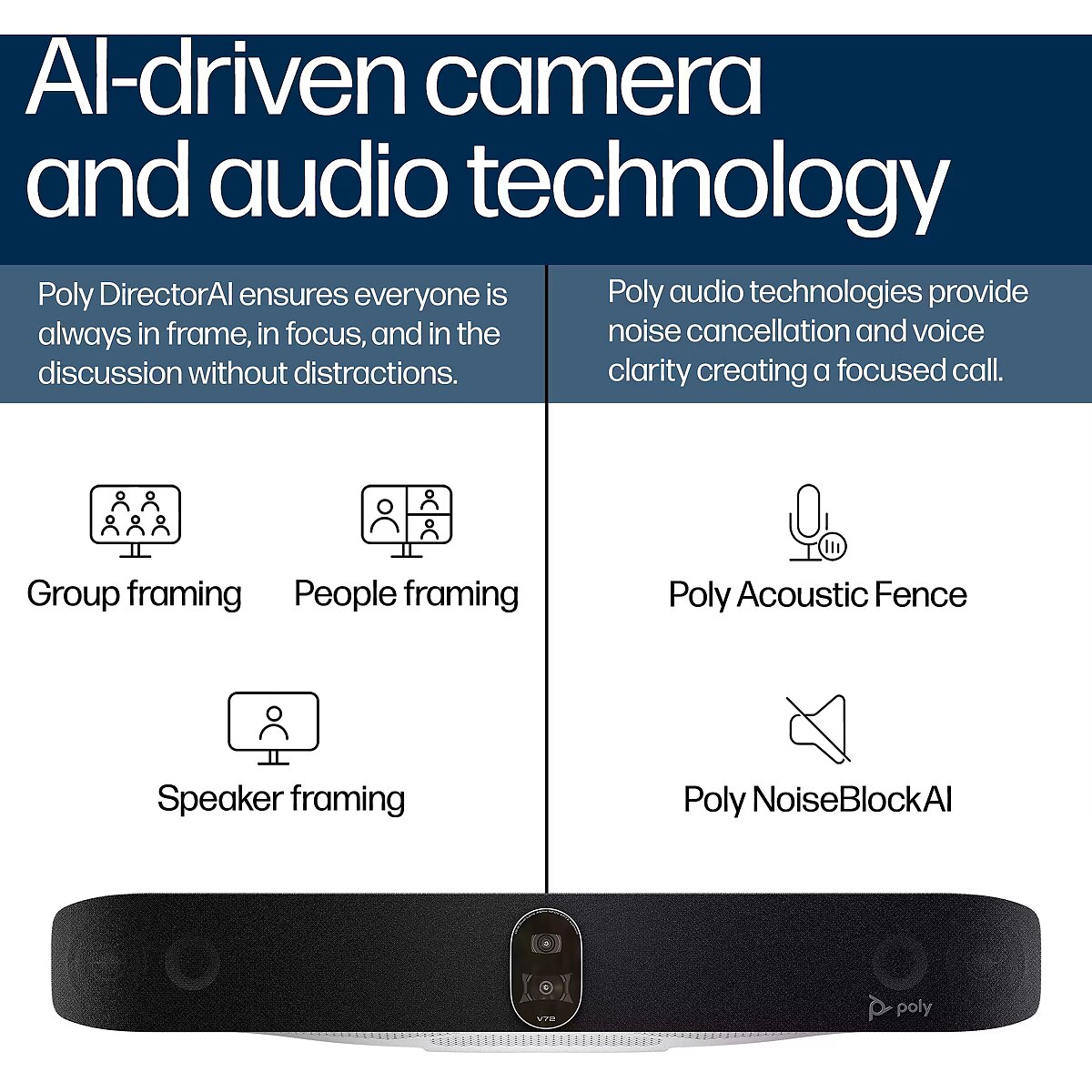 LongDesc - Exceptional AV capabilities. USB simplicityGet a deeper level of collaboration in large spaces with the Poly Studio V72 premium USB video bar. Simple and scalable, it's optimized for PC-based rooms, with Poly DirectorAI and NoiseBlockAI tech, and certified compatibility with major cloud video platforms.