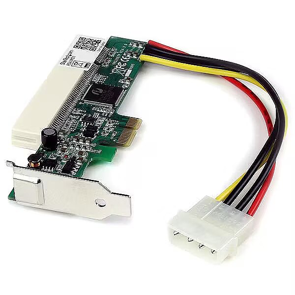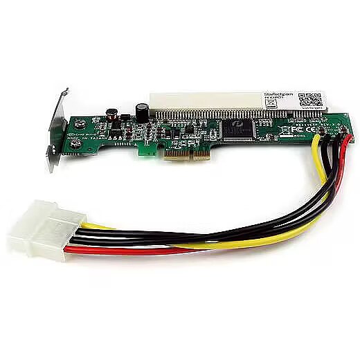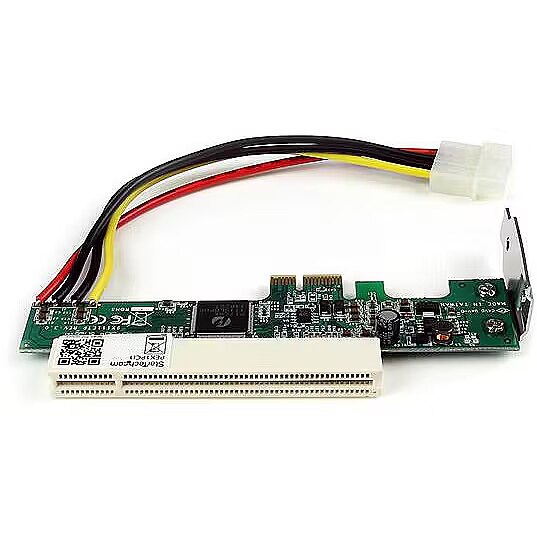 LongDesc - Install half-height/low profile PCI interface cards in a standard PCI Express expansion slotThis PCIe to PCI Adapter Card lets you use low profile PCI expansion cards in a server or desktop motherboard PCI Express slot. Compliant with PCI Express Specification 1.0a and PCI Specification 2.2, the adapter card connects through a PCIe 1x slot to provide a low profile PCI slot in its place. A spare full size bracket for PCI Express card is also included for use in larger desktop or server PCI Express slots.A versatile solution, the adapter card converts PCIe to PCI or PCI-X; a built-on LP4 power connector links the card to the computer power supply, allowing you to install universal voltage PCI cards (3.3V/5V).The adapter card offers an economical solution that lets you extend the usability of older or extra PCI Bus cards in newer PCIe capable systems.To ensure suitable installation, the PCIe/PCI adapter features an innovative bracket design that adapts and secures the low profile PCI or PCI-X card into the converted slot.The StarTech.com Advantage