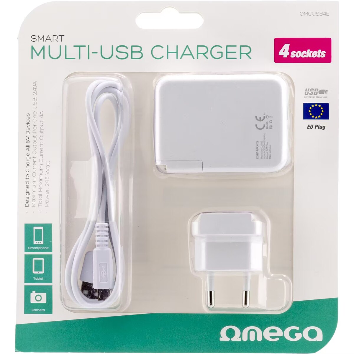 name_ru - Omega USB зарядное устройство 4xUSB EU + кабель, белый (42672)