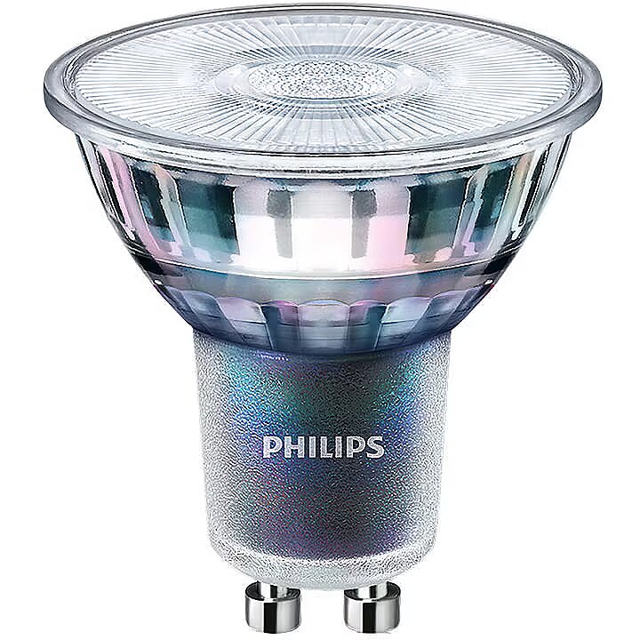 LongSummaryDescription - Philips MASTER LED ExpertColor 5.5-50W GU10 930 36D. Bulb power: 5.5 W, Equivalent bulb power: 50 W, Fitting/cap type: GU10, Luminous flux: 375 lm, Bulb lifetime: 40000 h, Light colour: White, Colour temperature: 3000 K, Beam angle (max): 36°, Color Rendering Index (CRI): 97, Power factor: 0.8