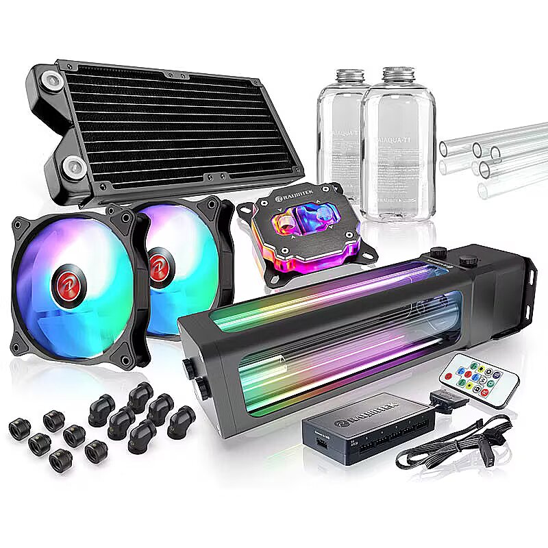 Technical_details - SCYLLA PRO CA240 240mm, water cooling The Raijintek SCYLLA PRO CA240 240mm is a complete hard tube water cooling kit. A premium quality DIY Water Cooling Solution. An all-copper FORKIS PRO RBW CPU water block, a powerful ANTILA D5 EVO RBW ADD pump/reservoir combo, an all-copper 240mm radiator, 2 bottles of 500ml RAIAQUA-T1 Pure Clear Premium-Coolant, EOS 12 ADD PWM fan with a high static pressure, 12 full copper fittings 90°*6 & 180°*6, 4*500mm PETG hard tubes and a 5-port 5V addressable (rainbow) CONTROL HUB with a 5- Port PWM and remote control, a M/B connector cable to sync with your M/B or remote control. Raijintek offers all enthusiasts the best DIY Watercooling System experience. Type: DIY kit Color: Black EAN: 4715109923384 Manufacturer number: 0R10B00215 Type: Water Cooling Kit Suitable sockets: 1150, 1151, 1155, 1156, 1366, 2011, 2011-3, 775, AM2, AM2+, AM3, AM3+, AM4, 2066 Fastening: screwed Loudness: 28dB CPU: up to max. TDP | 440 watts Equipment: LED lighting LED lighting: Yes, addressable RGB headers LED lighting: color | RGB RGB Standard: AURA Sync, Mystic Light, RGB Fusion, RGB LED Speed: 800 to 1,800 rpm Heat sink material: copper Fan Bearing: Hydro Flow rate: 75 cfm Air pressure: Up to 2.3 mm/H2O Radiator size: 2x 120 mm Pump: input voltage | 12v Pump: speeds | 1,800 rpm, 2,500 rpm, 3,300 rpm, 4,000 rpm, 4,800 rpm Power connector: 4-pin PWM Voltage range: 7 - 12 volts Additional Information: Connection: SATA, 2510-3P [NA / NA / Fg ], Addressable LED: 12 LED Rainbow (4-Pin Header, 2510 Spec), LED Control: Motherboard RGB HEADER/ Remote Control and RJK Control Box, LED Input Connector : 4-pin header (2.5 crimp), LED input voltage: 5V, lighting mode: through the MB software or 20 lighting modes & 7 different static colors through the 5V ADD control hub from Raijintek Accessories: available | 8x installation screws, 1x ARGB-PWM Control Hub, 1x remote control Dimensions: Fan1 | Quantity: 2 pieces, width: 120 mm, height: 120 mm, depth: 25 mm Dimensions: Heatsink | Width: 120mm x Height: 27mm x Depth: 273mm Dimensions: Overall | Width: 120mm x Height: 52mm x Depth: 273mm