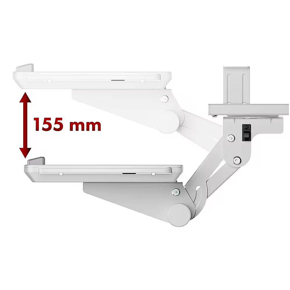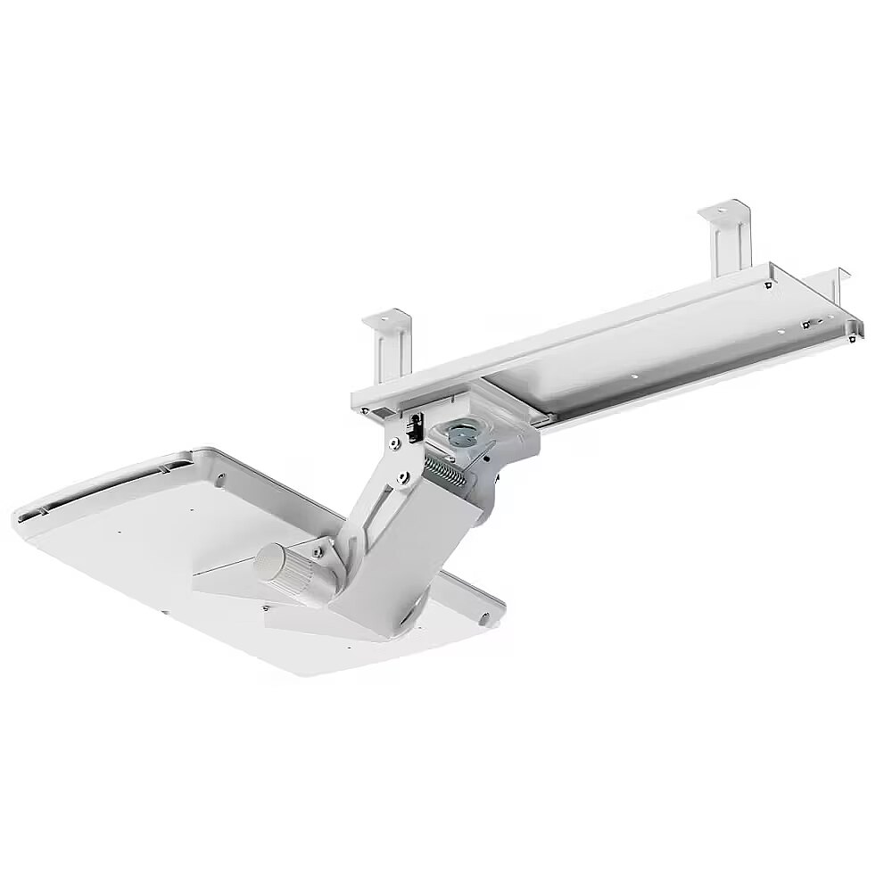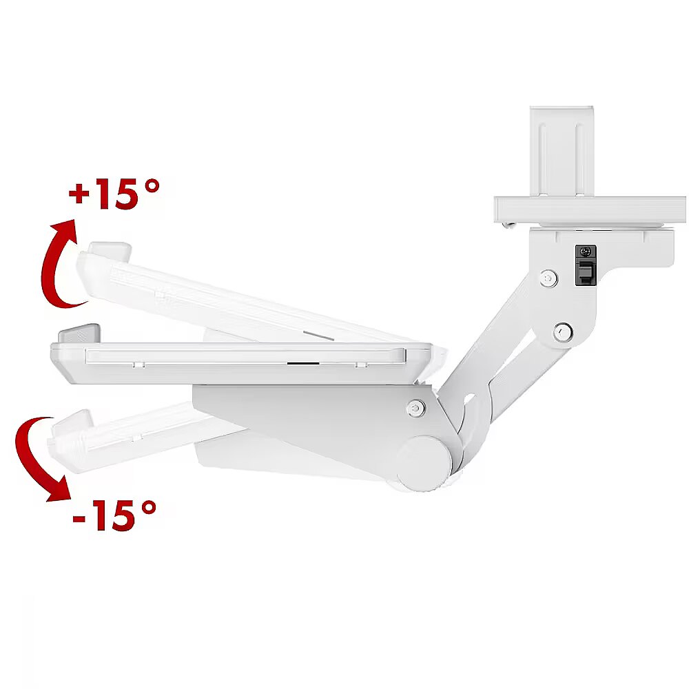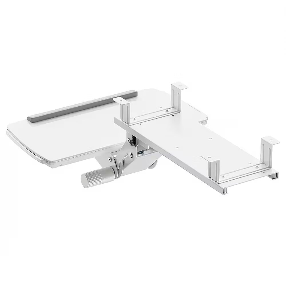 Other features - An additional advantage of the MC-156 holder is its adjustable height and full range of horizontal movement - the shelf can be rotated 90 degrees left and right. Such flexibility allows you to easily adjust the position of the keyboard to suit your current needs or hide it under the desk when not in use. This is a solution that not only improves the ergonomics of work, but also affects the aesthetics and organization of the computer workstation, especially in office spaces or home offices. Saves space - under-desk mounting helps keep your work surface tidy Maximum weight capacity of up to 5 kg - sturdy construction for stability and durability Pull-out mouse shelf with right or left side extension, Ideal for right- and left-handed users Adjustable keyboard tilt up to 15° increases ergonomics and reduces tension in the wrists Height adjustment allows you to adjust the keyboard position to suit your individual needs Slide-out design makes it easy to tuck the keyboard in and out from under the tabletop 90° left and right swivel capability makes it easy to angle the keyboard or move it out of the way Color: white, Tilt adjustment: -15° to +15° Swivel adjustment: 180° Master material: powder-coated steel, plastic