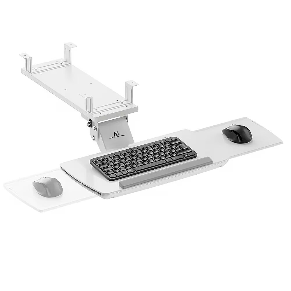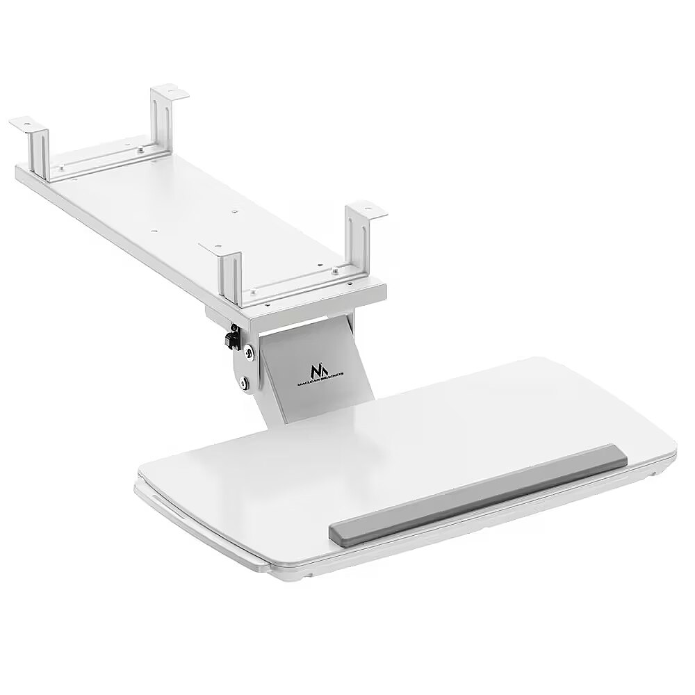 Description - Desk keyboard holder adjustable white Maclean under-desk keyboard holder, adjustable, max. 5kg, white, MC-156 W The MC-156 keyboard holder is a practical and ergonomic solution for people who value order and convenience in the workplace. Thanks to its mounting under the desk top, the holder allows efficient use of working space, while ensuring a comfortable position while typing. The construction made of solid materials ensures stability and durability, and the maximum load of up to 5 kg allows safe use of both light and heavier keyboards. The handle's functionality has been expanded to include a pull-out mouse shelf, which can be extended on both the right and left sides - making this model ideal for both right- and left-handed users. The handle also allows you to adjust the tilt of the keyboard within a range of up to 15 degrees, allowing you to perfectly adjust the working angle to suit your individual needs, thus reducing tension in your wrists and forearms.