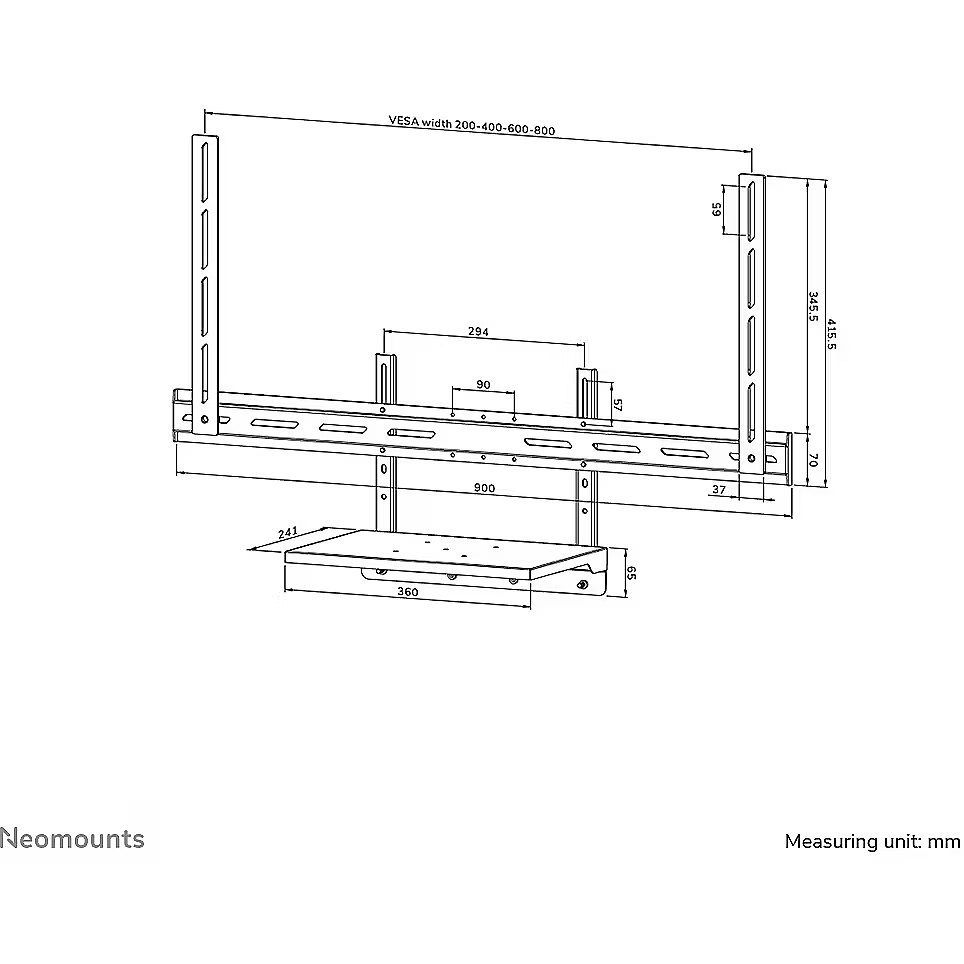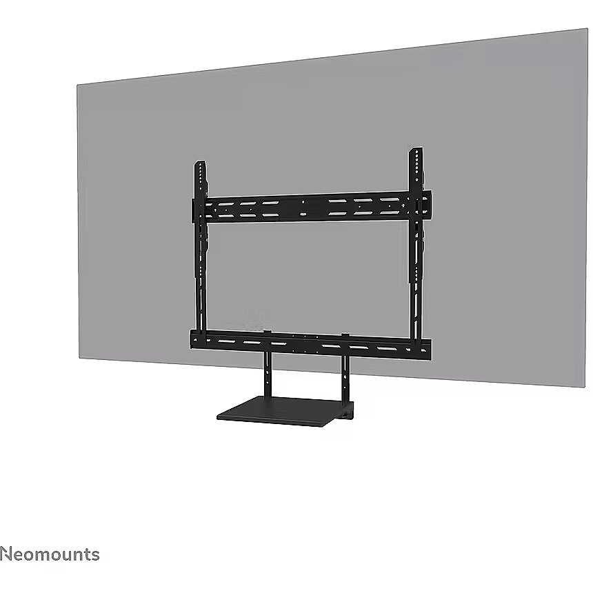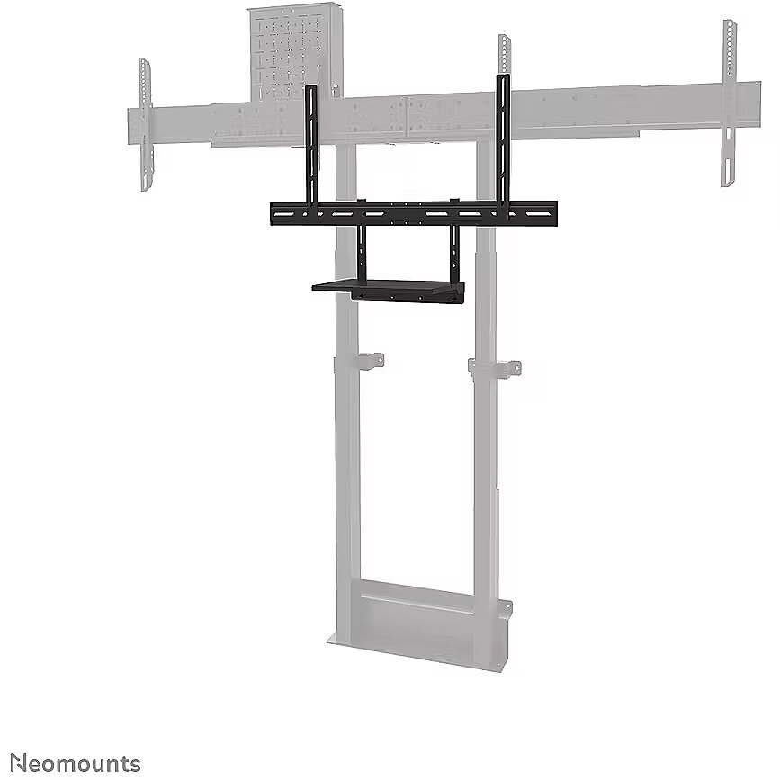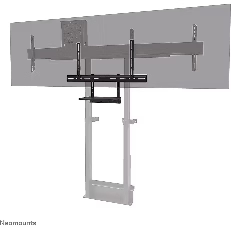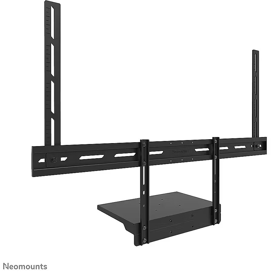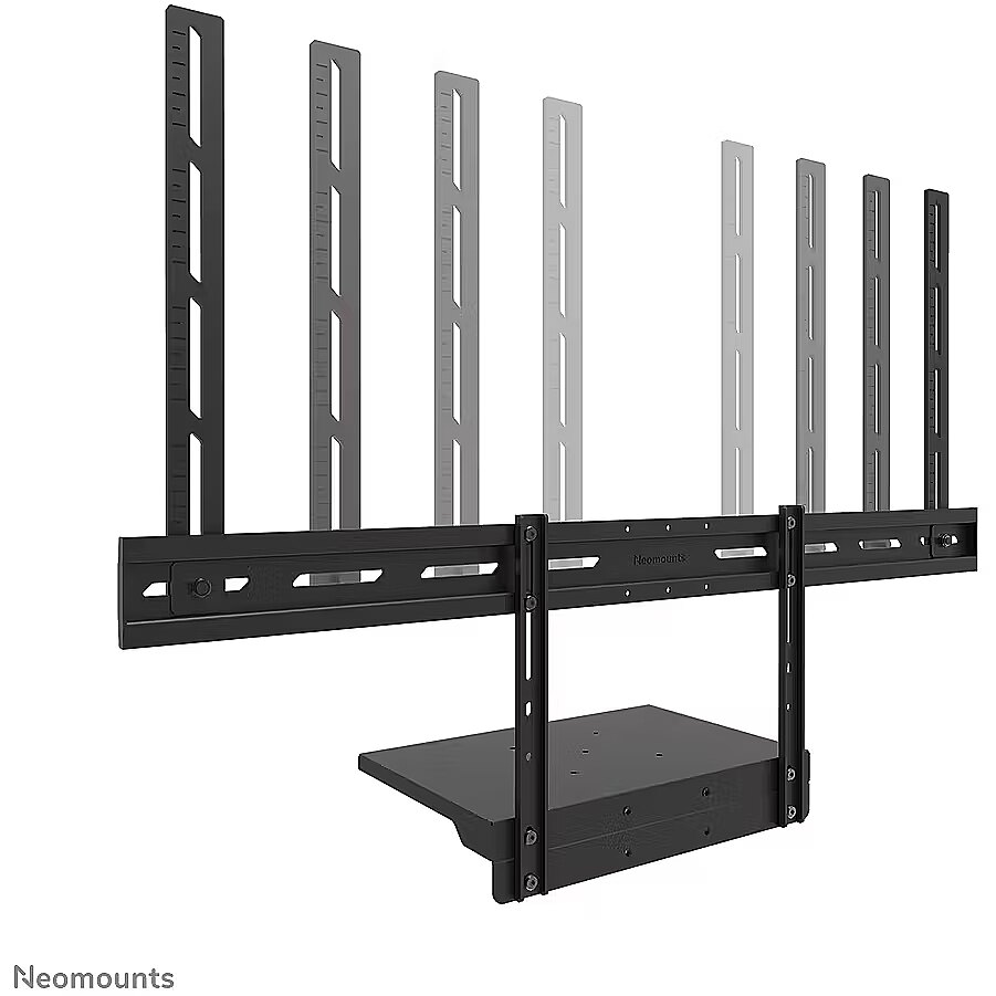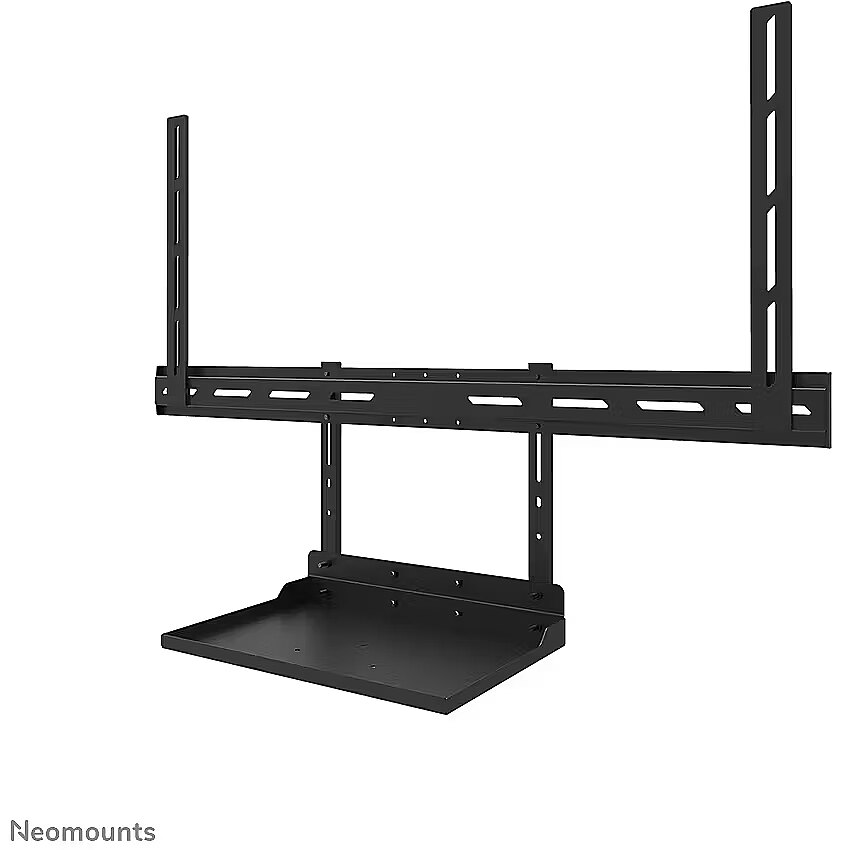 LongDesc - The Neomounts AV45-500BL is a universal laptop shelf kit designed for installation under displays from 43" and larger, supporting VESA hole patterns from 200x200 up to 800x600 mm. The VESA-based design makes the shelf compatible with all VESA-oriented trolleys and wall mounts, ensuring broad applicability across different setups. Both the shelf support and backplate brackets are height-adjustable, providing maximum flexibility. The AV45-500BL mounting holes accommodate width and height variations, while the VESA frame adjusts in four positions (200/400/600/800). The kit is suitable for use with both wall and floor mounts and has a maximum load capacity of 2,5 kg. Installation is quick and straightforward, with ruler-guided alignment ensuring a precise and seamless fit.For detailed compatibility with specific models and mounting sizes, please refer to the online manual.