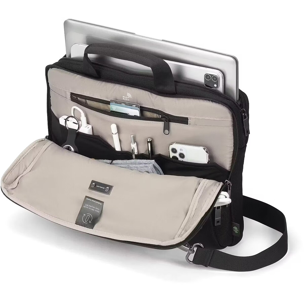 Description - Lightweight, secure, and designed for effortless mobility, the Slim Case FIVE keeps your essentials protected without the bulk. The lockable notebook compartment with DCT Notebook Protection ensures maximum safety, while an integrated slip pocket securely holds tablets up to 12.9". A front compartment with structured pockets organizes accessories, and a separate back compartment provides dedicated space for documents. Made from 16.5 recycled PET bottles, it's a sustainable and practical choice for modern professionals.