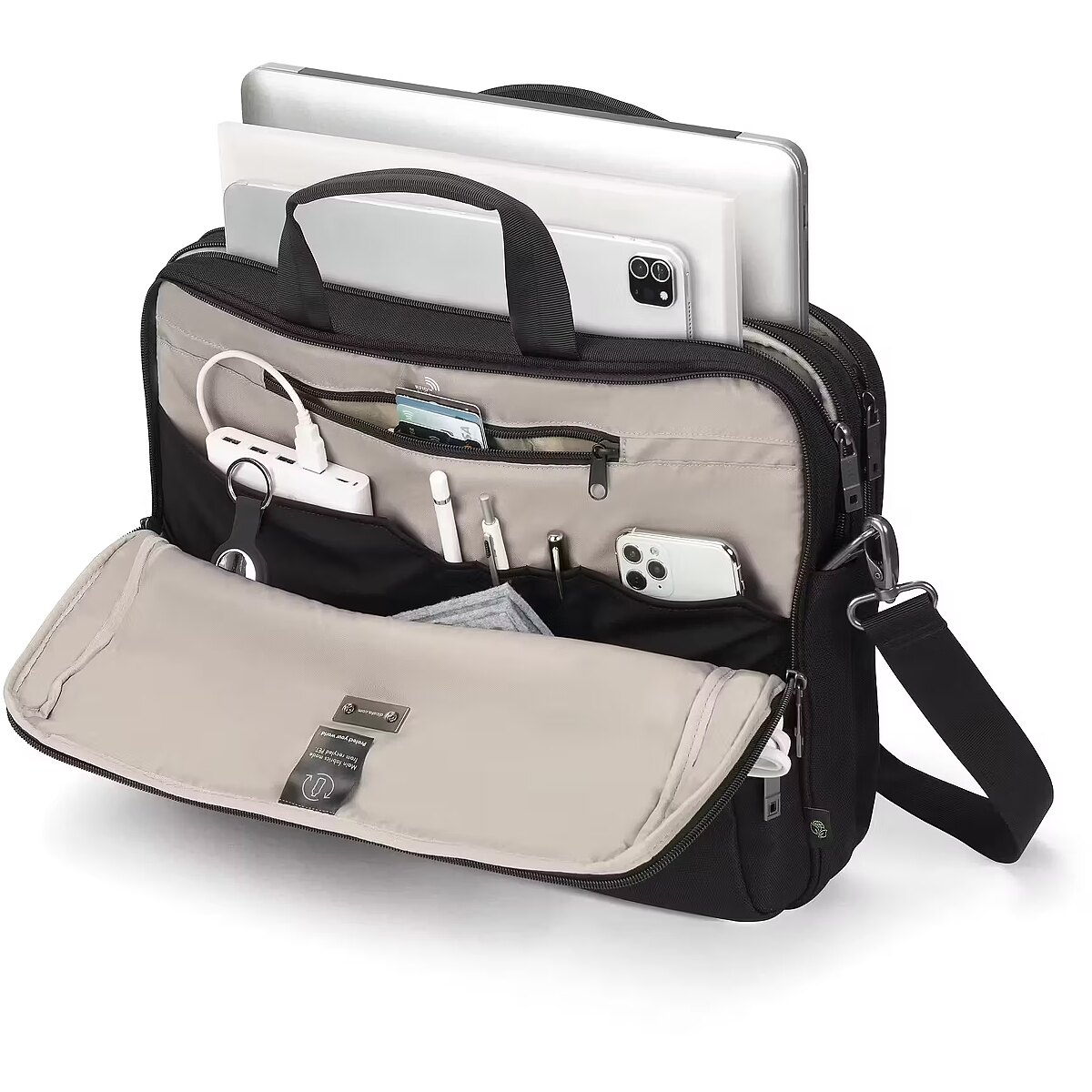 Description - The Top Traveller FIVE is designed to protect your devices while keeping essentials easily accessible. The lockable notebook compartment with DCT Notebook Protection and HDF foam & EVA corner padding ensures maximum security, while an integrated slip pocket provides safe storage for tablets up to 12.9". The main compartment offers ample space for documents, folders, or mobile equipment, and the front section features organized pockets for accessories. A small front pocket adds extra storage for cables and smaller items. Made from 23.5 recycled PET bottles.