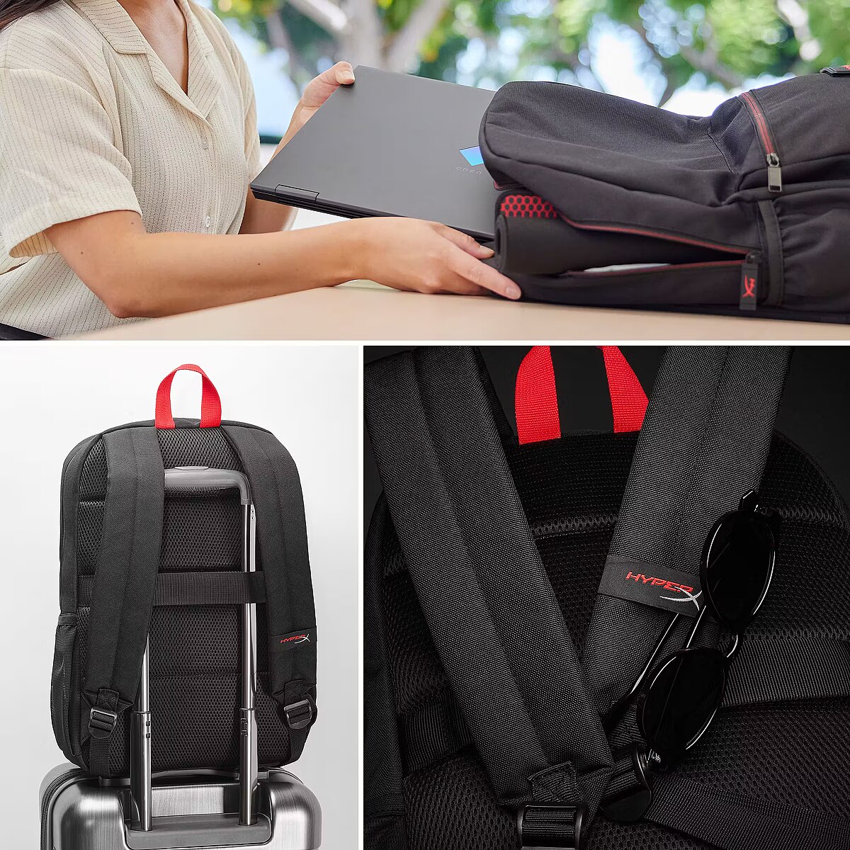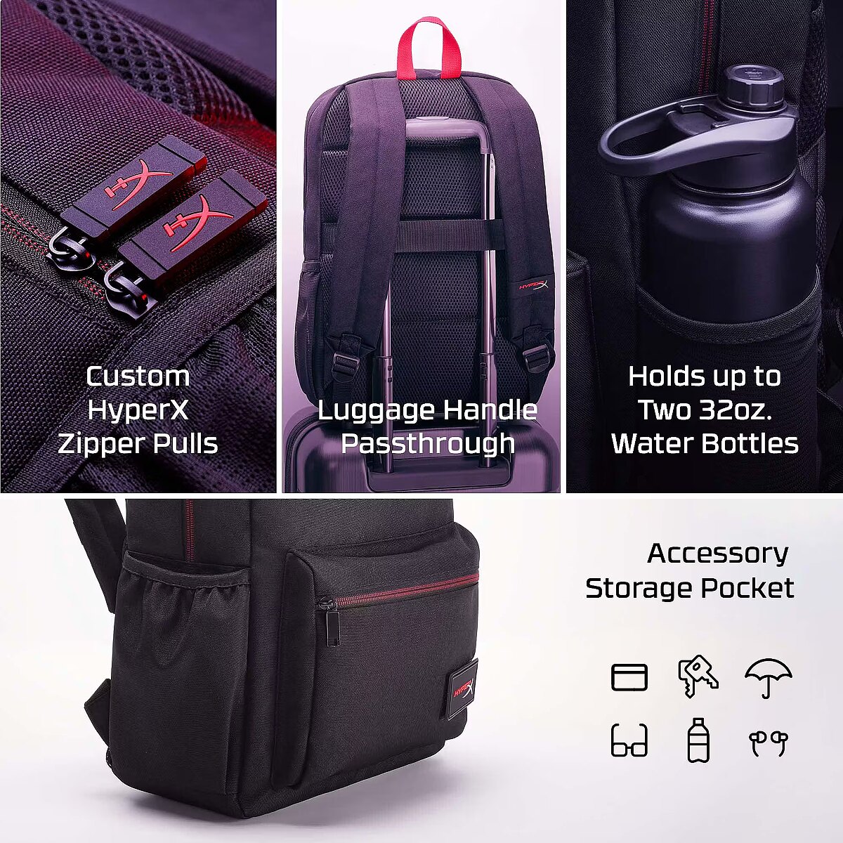 LongDesc - Stylish everyday backpack for your gaming gear.If you’re the type of gamer who’s never really AFK, the HyperX Delta is an ideal everyday backpack to tote your daily essentials, plus your gaming gear. HyperX Delta is the perfect mix of utilitarian function and stylish form. It features classic HyperX colors, custom zipper pulls, a unique lining, and a removable HyperX patch so you can tastefully rep your love of HyperX and gaming while you’re out and about. The exterior utility pockets offer plenty of cargo space for water bottles and other small items. This durable backpack is partially constructed from recycled 600D polyester that resists rips and tears and provides a weather-resistant space for all those sensitive devices. Delta is a lightweight, compact bag built to optimize your daily commute and road trips. It can transport all your important gear without you needing to use additional straps and tie-downs.