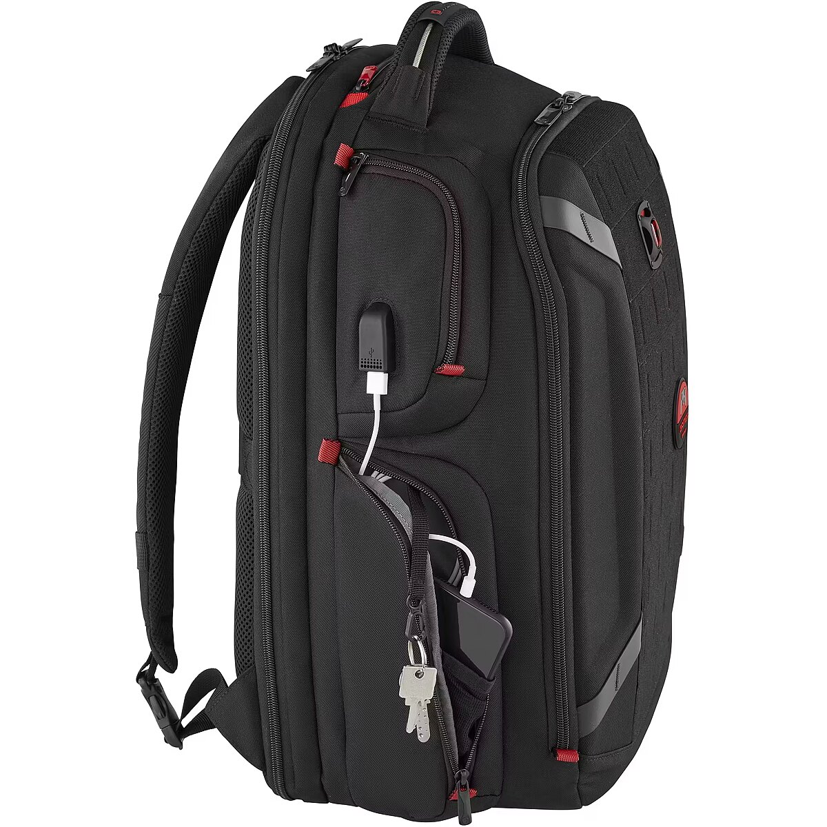 LargeDescHTML - 17.3'' Gaming Laptop BackpackPlug into premium functionality and pro-gamer performance with the PlayerOne backpack. Seriously good-looking, this tech-focused bag features a padded compartment for your laptop, as well as a purpose-built headset pocket and an EVA molded front compartment, which also holds a cool gamer patch. Thanks to the clever design, you can easily access all your everyday essentials, and the USB port keeps you connected on the move.Velcro material offers placement for event patchesSecurity S/R bucklePadded pocket for gaming keyboardDedicated headset pocketAirflow back padding keeps wearer coolReinforced cable haul handle for comfortable carryingPass-Thru trolley sleeve slides over the handle of wheeled luggage for easy travel with multiple bags